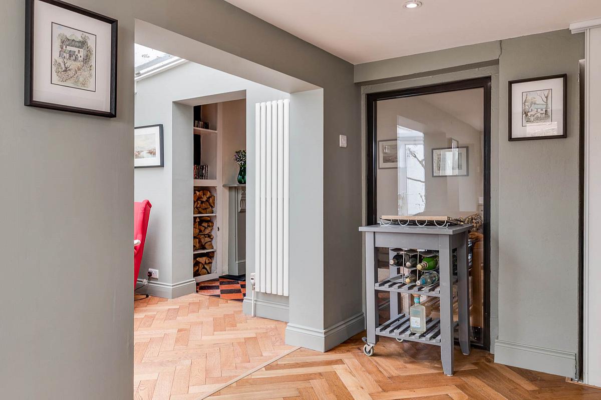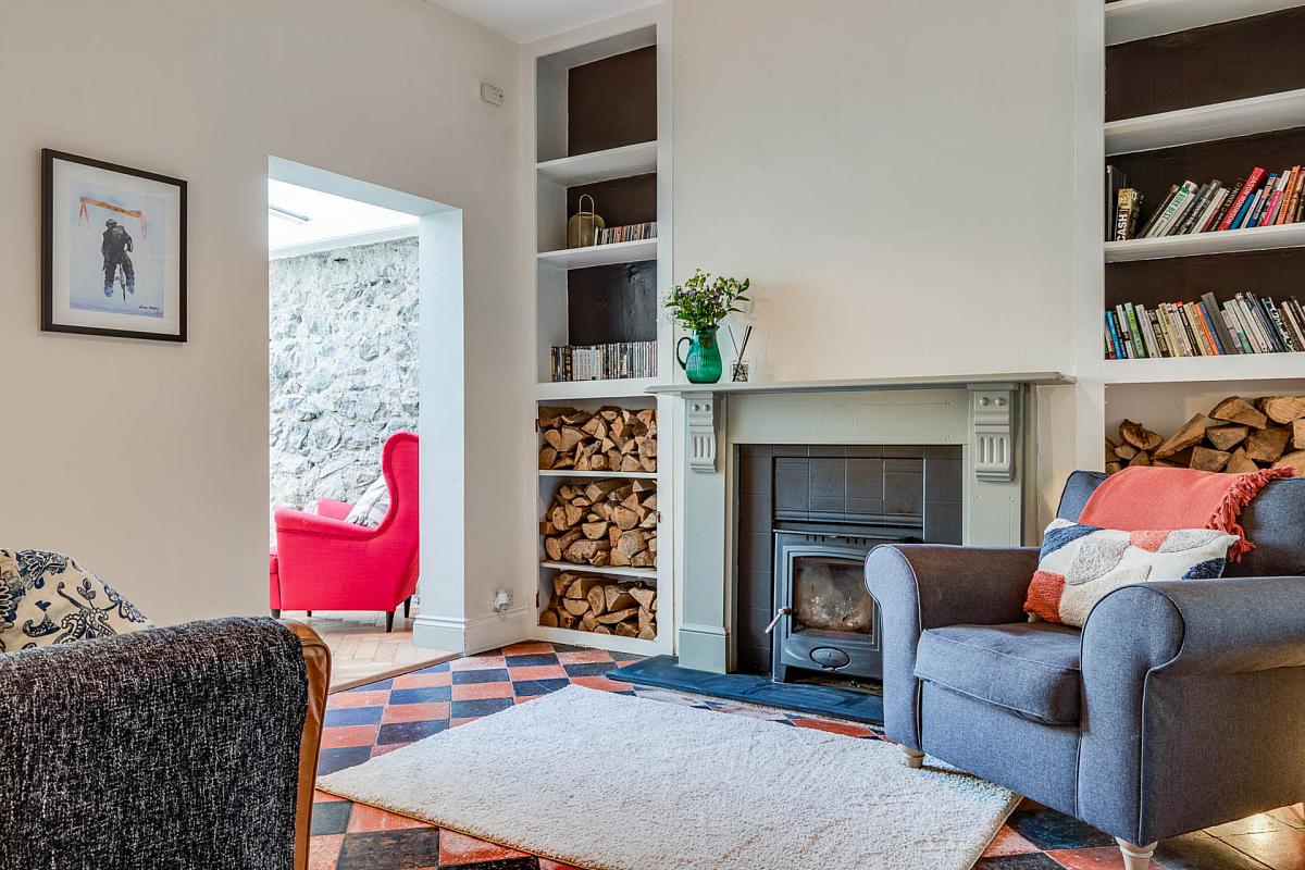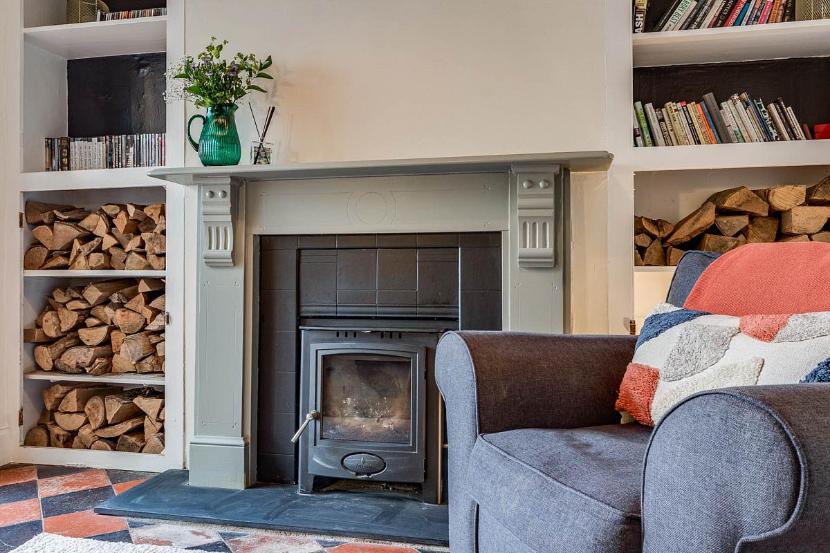 Original tiled flooring. Attractive fireplace with feature cast iron log burner. Built in wall shelving.
