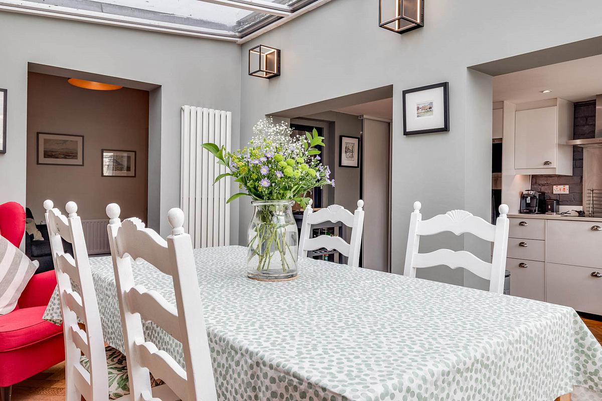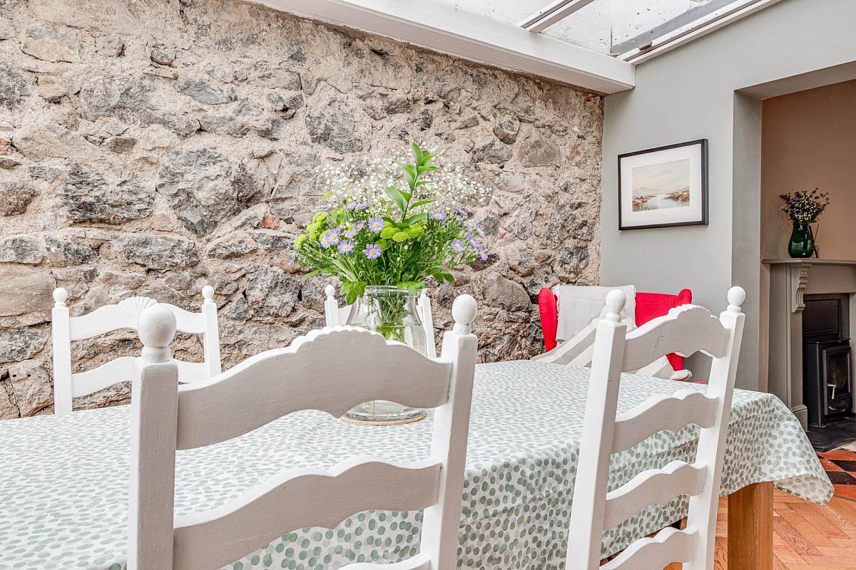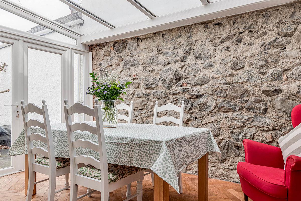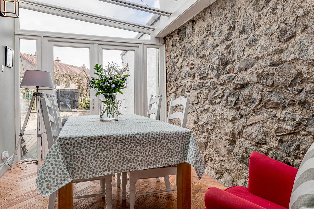 Feature original stone wall and glazed roof. Upvc french doors to rear walled courtyard garden.