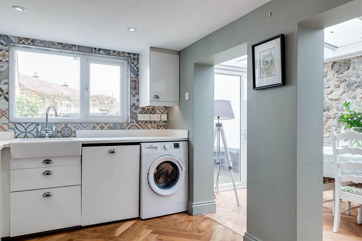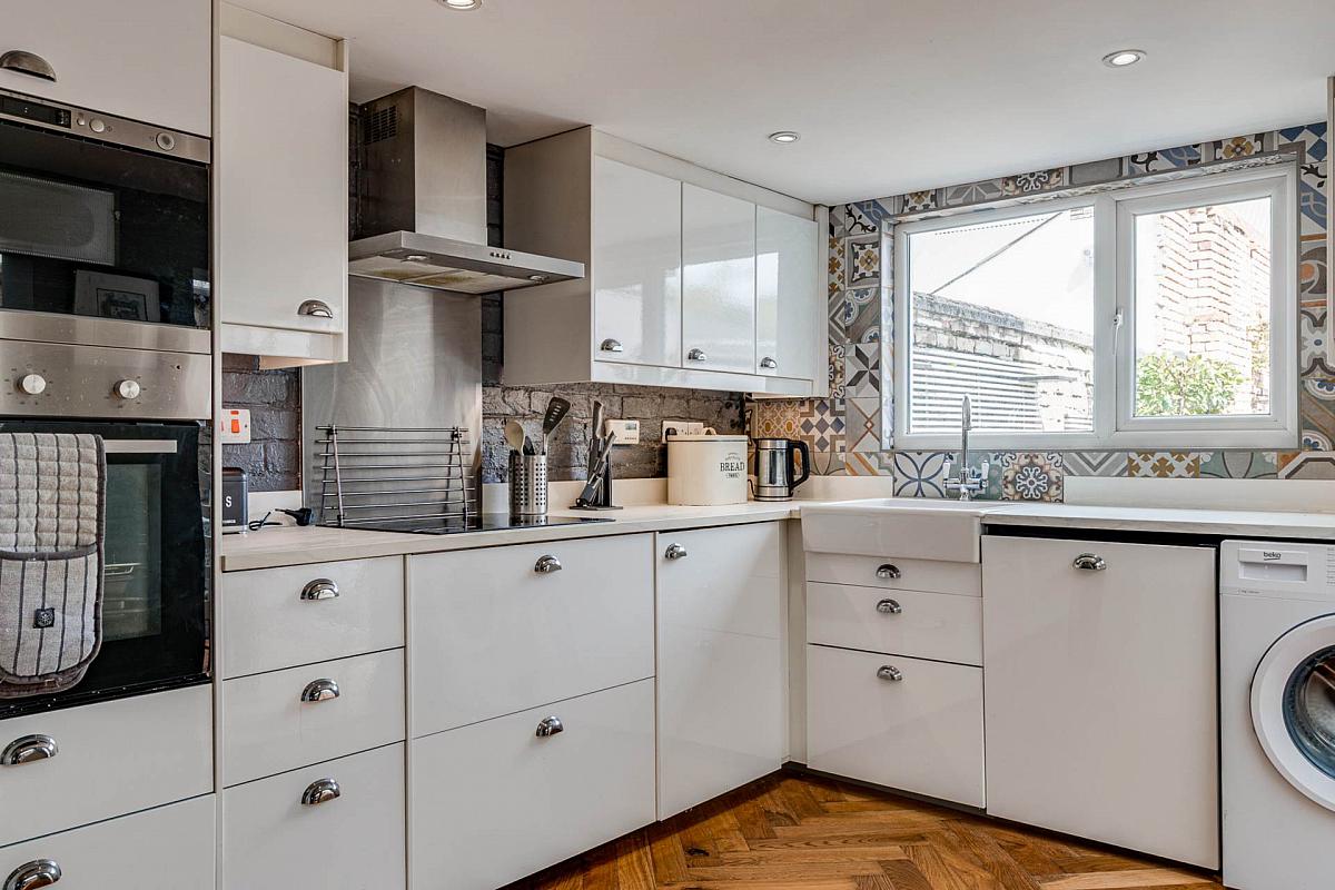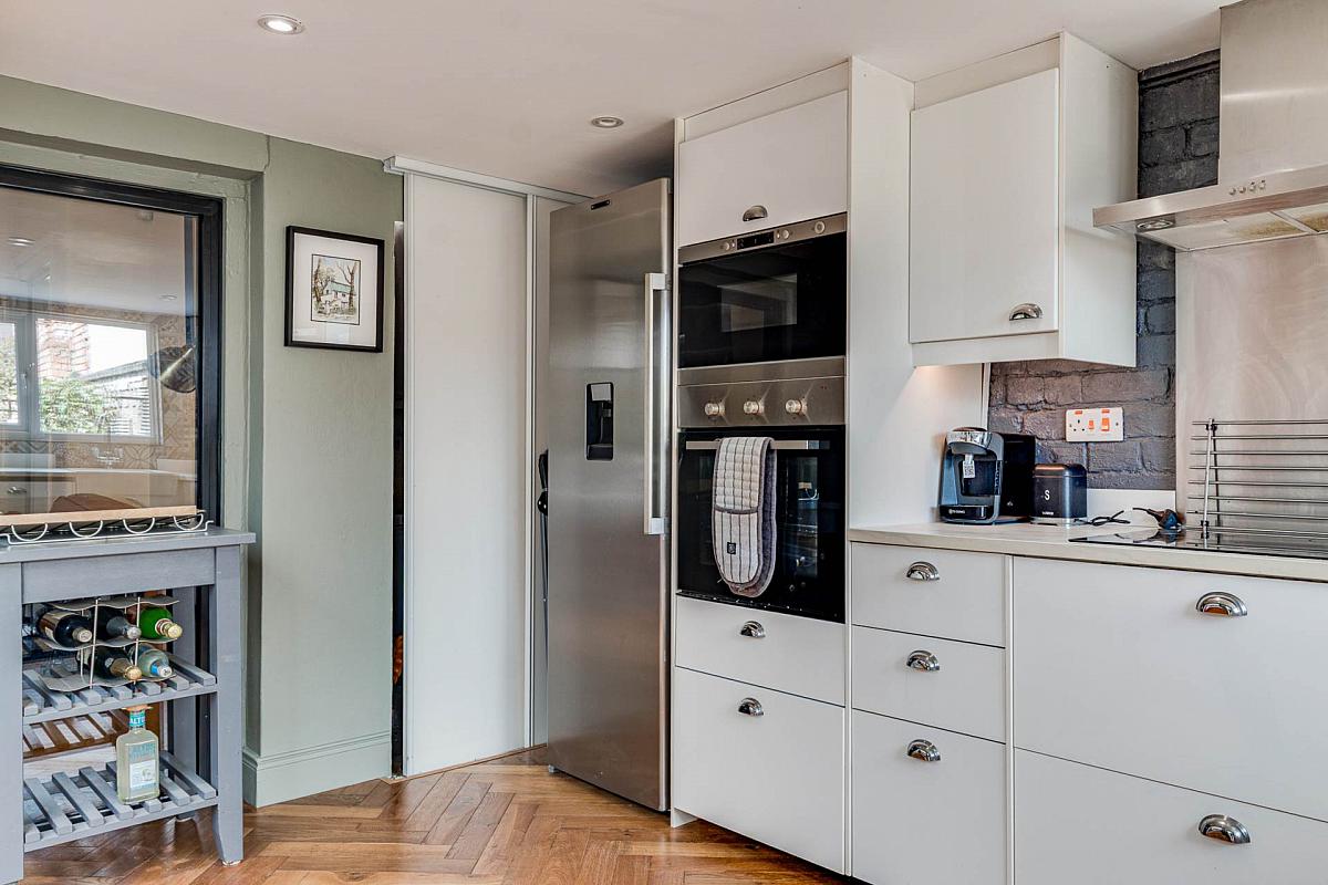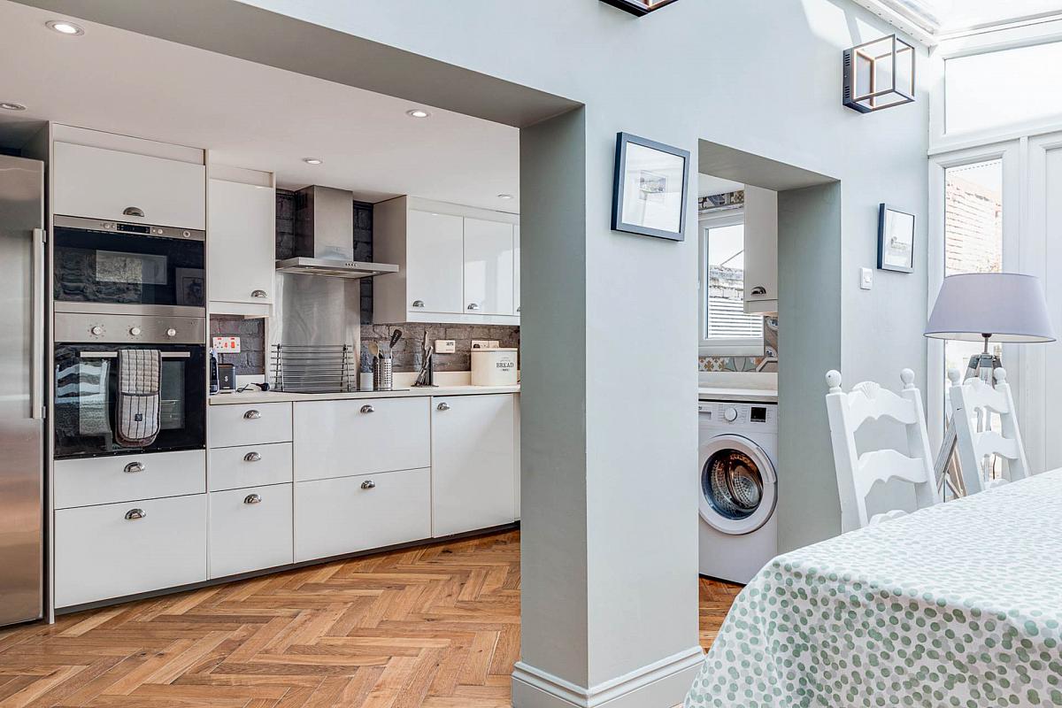 Excellent range of high and low level units with contrasting work surfaces and under unit lighting. Belfast style sink unit with mixer tap. Integrated hob with overhead extractor canopy. Integrated high level oven and microwave. Integrated dishwasher. Space for washing machine. Space for fridge/freezer. Ceramic tiled flooring. Open to:-