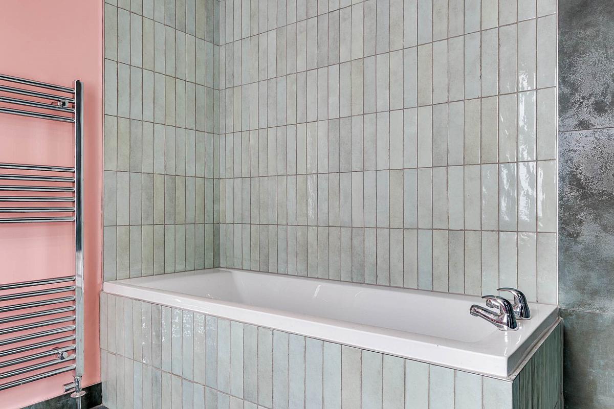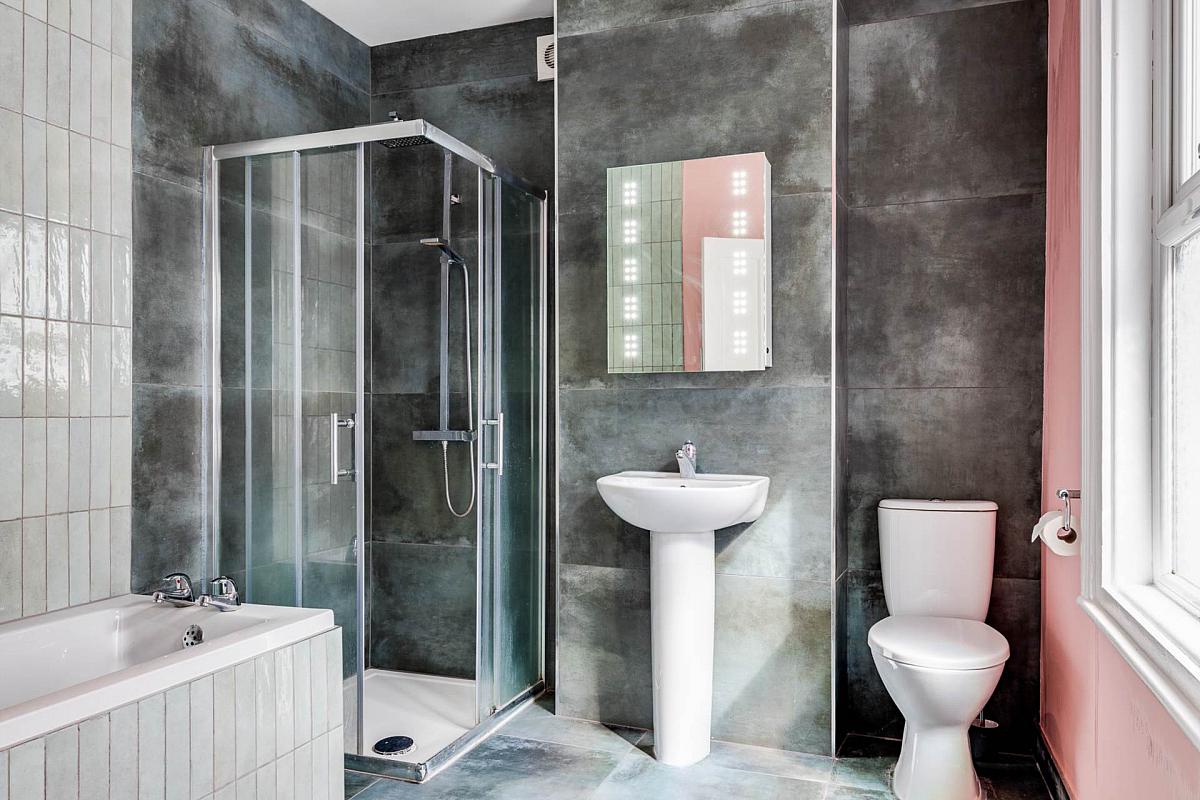 Superb four piece suite comprising pedestal wash hand basin, push button wc, panelled bath and separate shower enclosure with sliding glass door and twin shower heads.