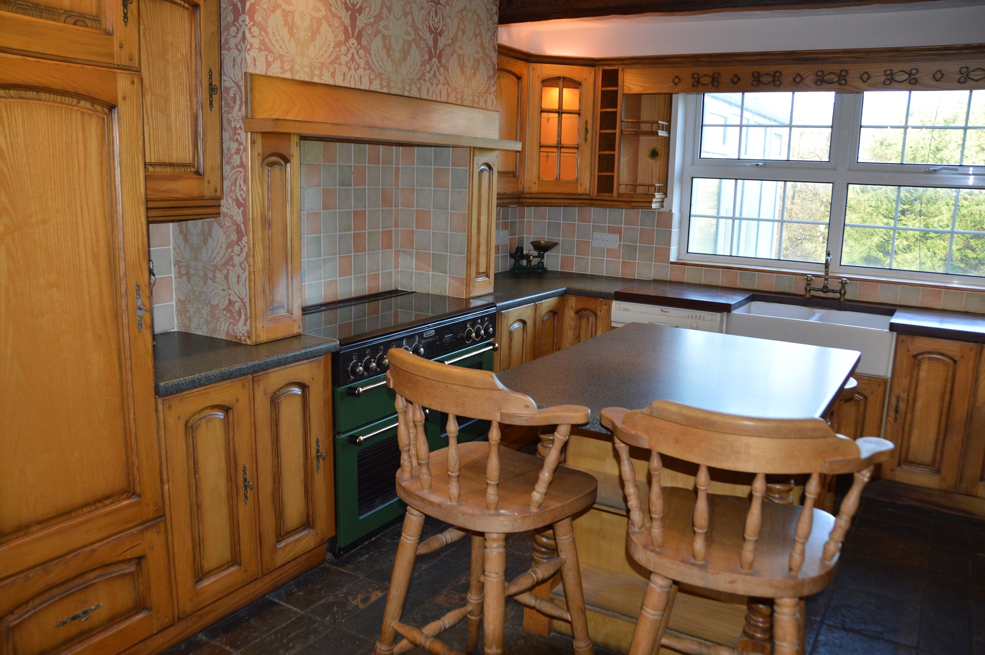 Fitted medium oak kitchen with range of high and low level units, Rangemaster 110 Leisure gas stove, double Belfast sink with mixer taps, integral fridge, plumbed for dishwasher, island with breakfast bar, space for casual dining.