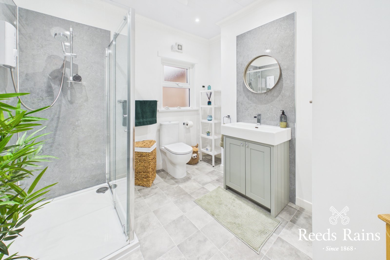 Deluxe and spacious shower suite comprising large walk in shower cubicle with electric shower, bespoke wash hand basin with vanity unit beneath and dual flush WC. Extractor fan. Built in airing cupboard.
