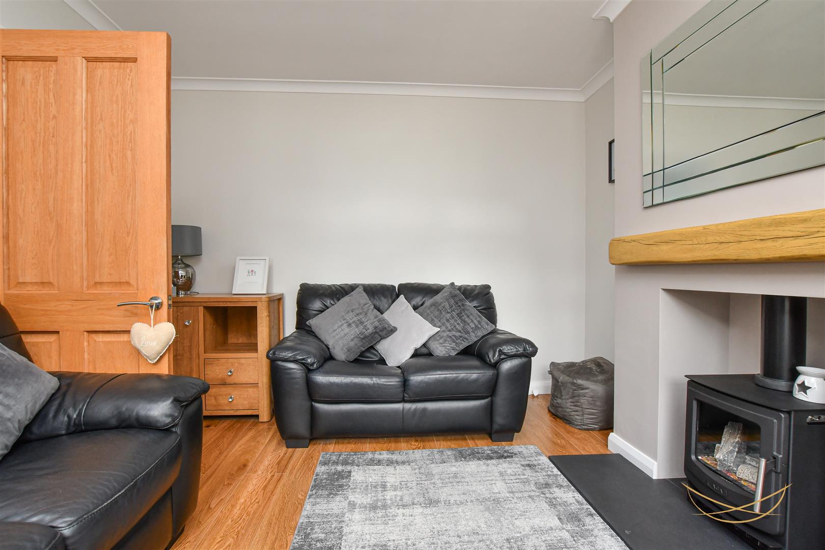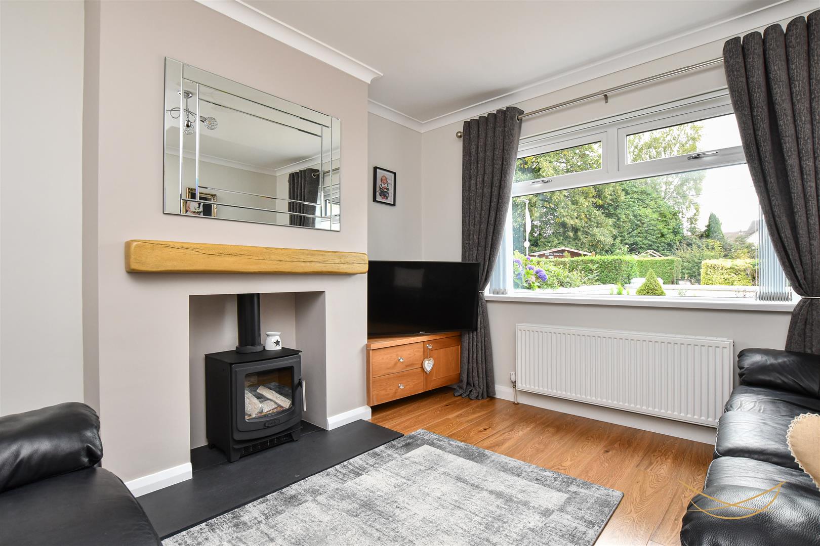 Wood effect laminate flooring. Electric stove inset. Cornice ceilings. Oak effect integrated tv unit.