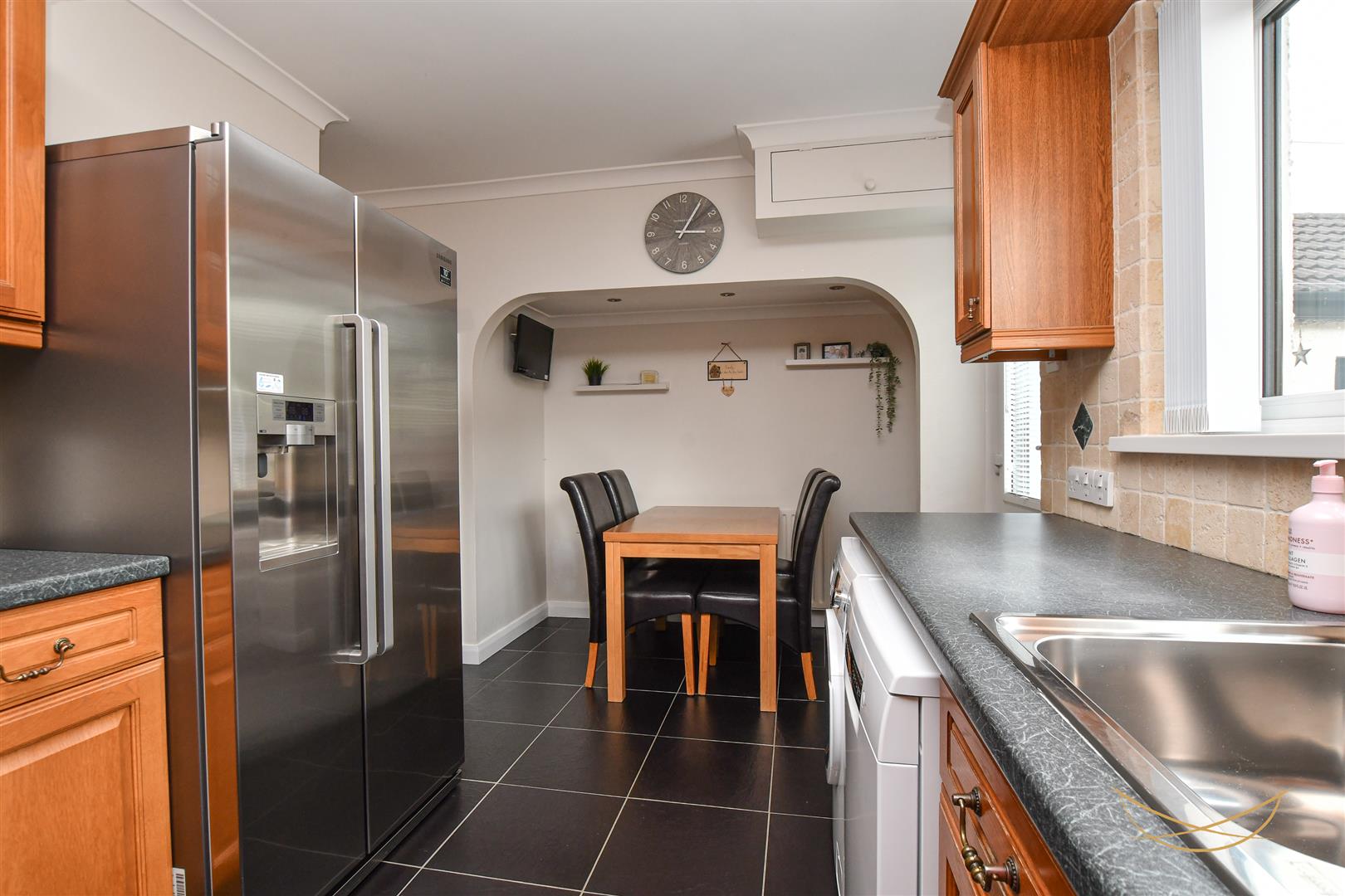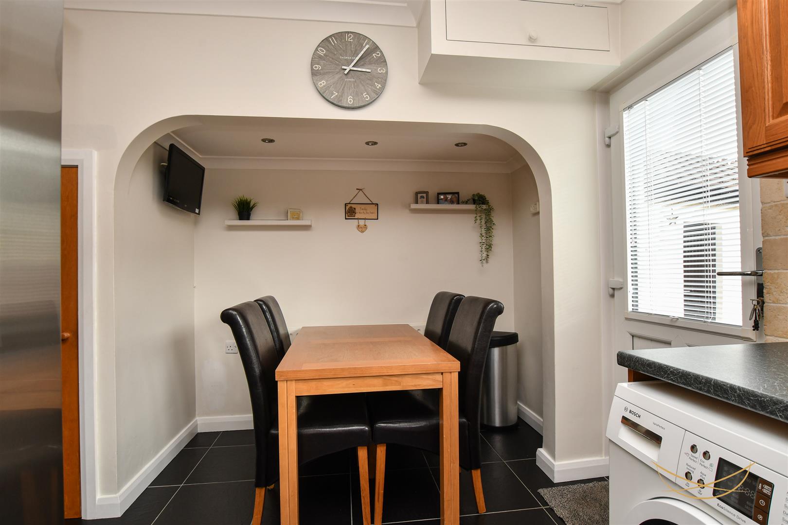 Range of high and low level units with recessed spotlights and contrasting formica worktops. Plumbed for appliances. Integrated oven and hob with overhead extractor fan. Tiled splashback. Alcove dining area.