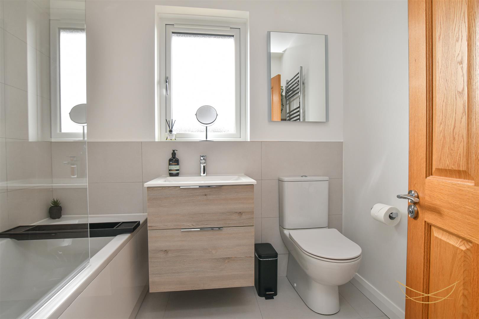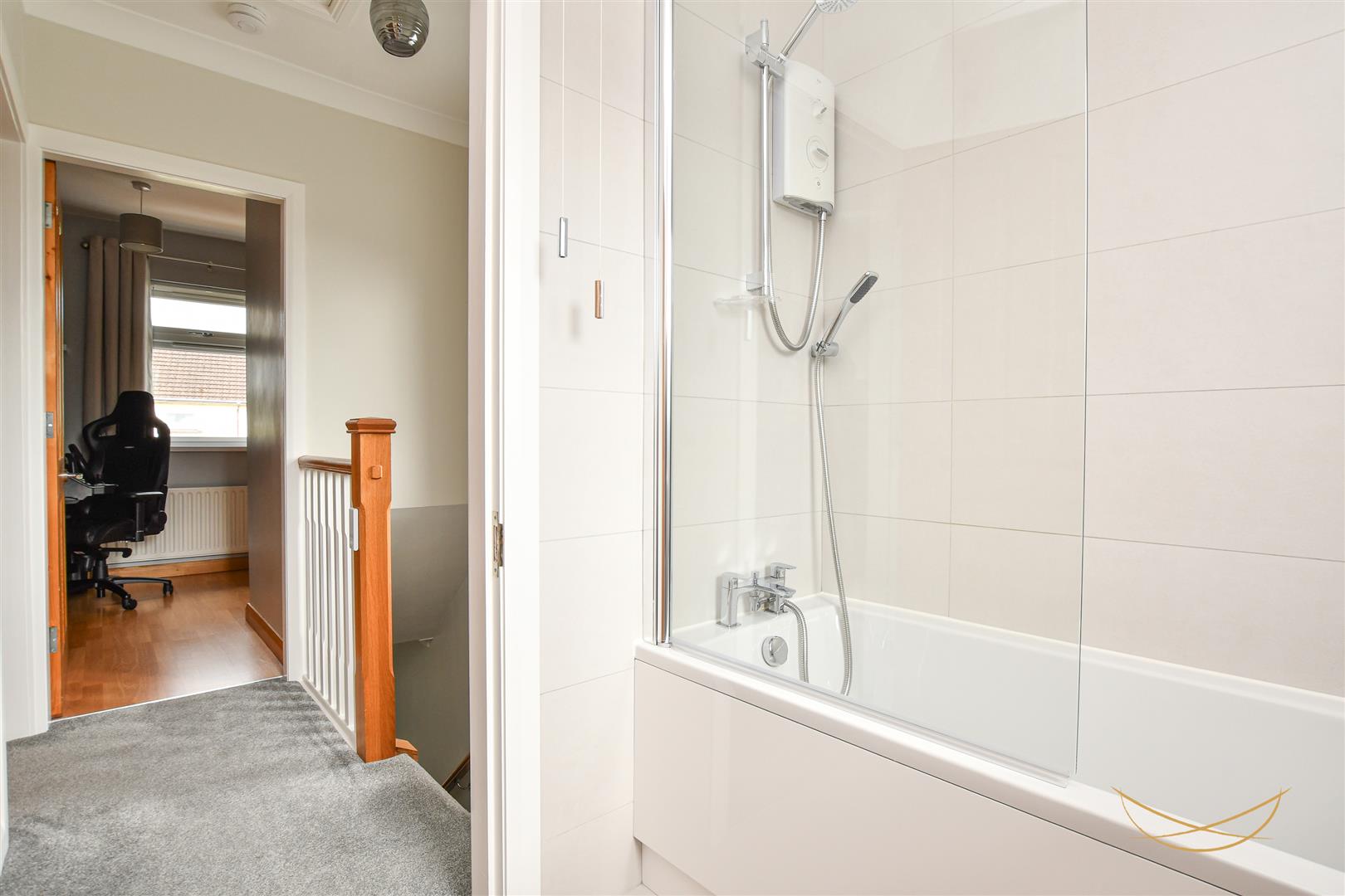 Contemporary three piece bathroom suite comprising low flush w/c, panelled bath with overhead electrical shower unit with rainfall attachment . Tiled flooring. Partially tiled walls. Floating vanity unit with ceramic basin and chrome mixer taps. Tall floating storage unit with shelving.