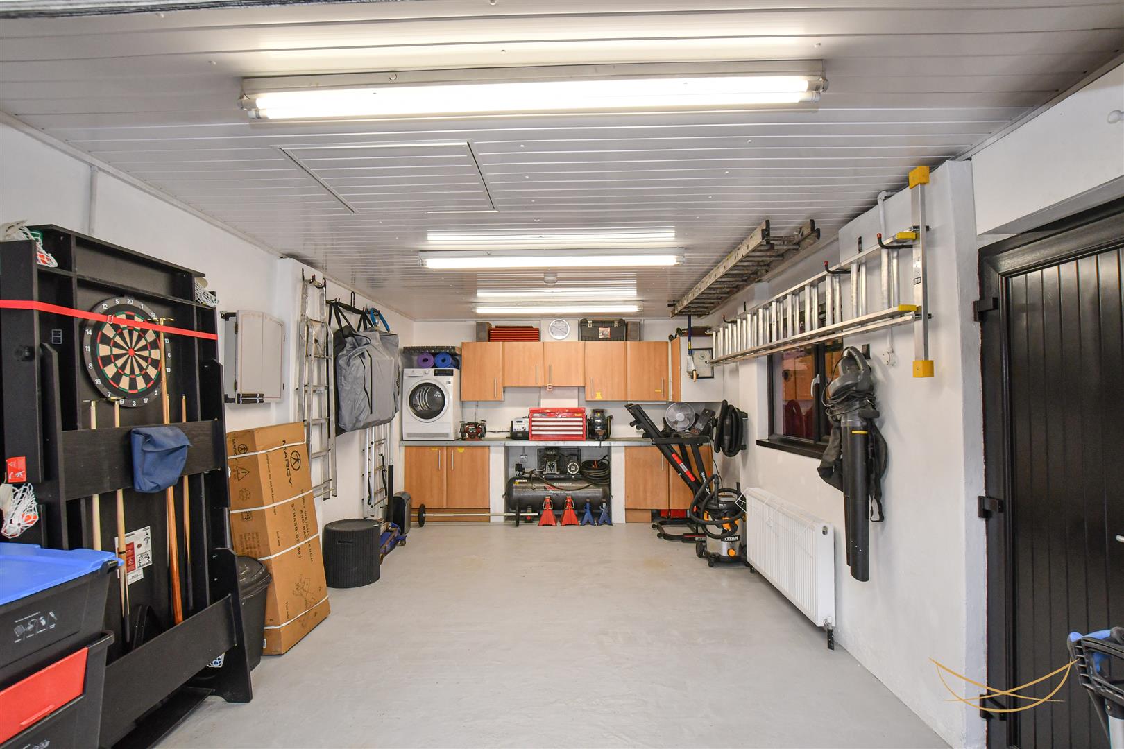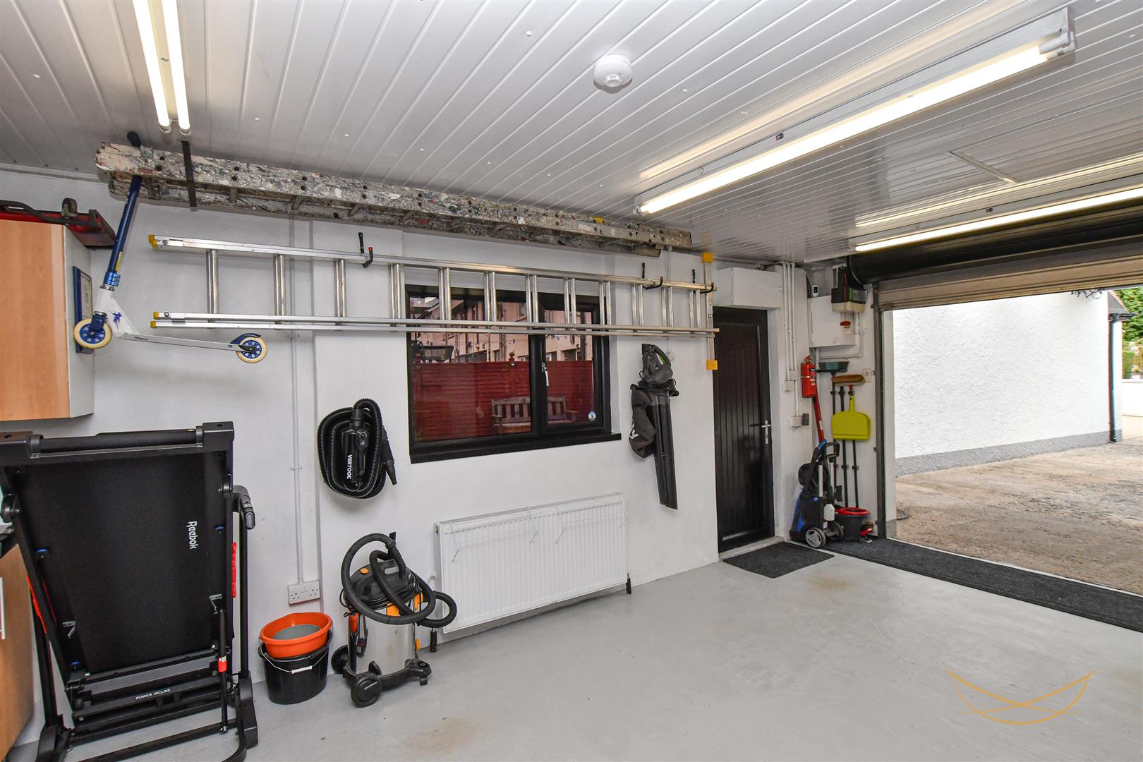 Electric roller door, power and light. OFCH boiler, uPVC ceiling. uPVC external door. Access to floored and insulated roofspace beyond the uPVC ceiling.