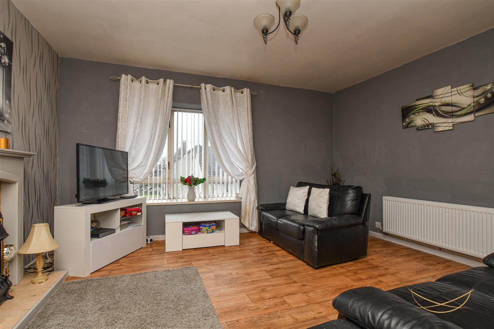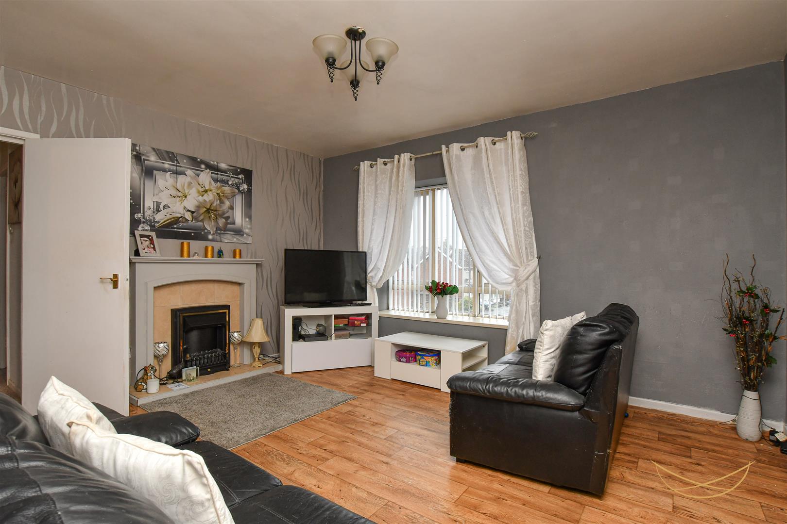 Feature electric fire with tiled inset and matching hearth. Wood surround and mantle. Laminate wood effect flooring.