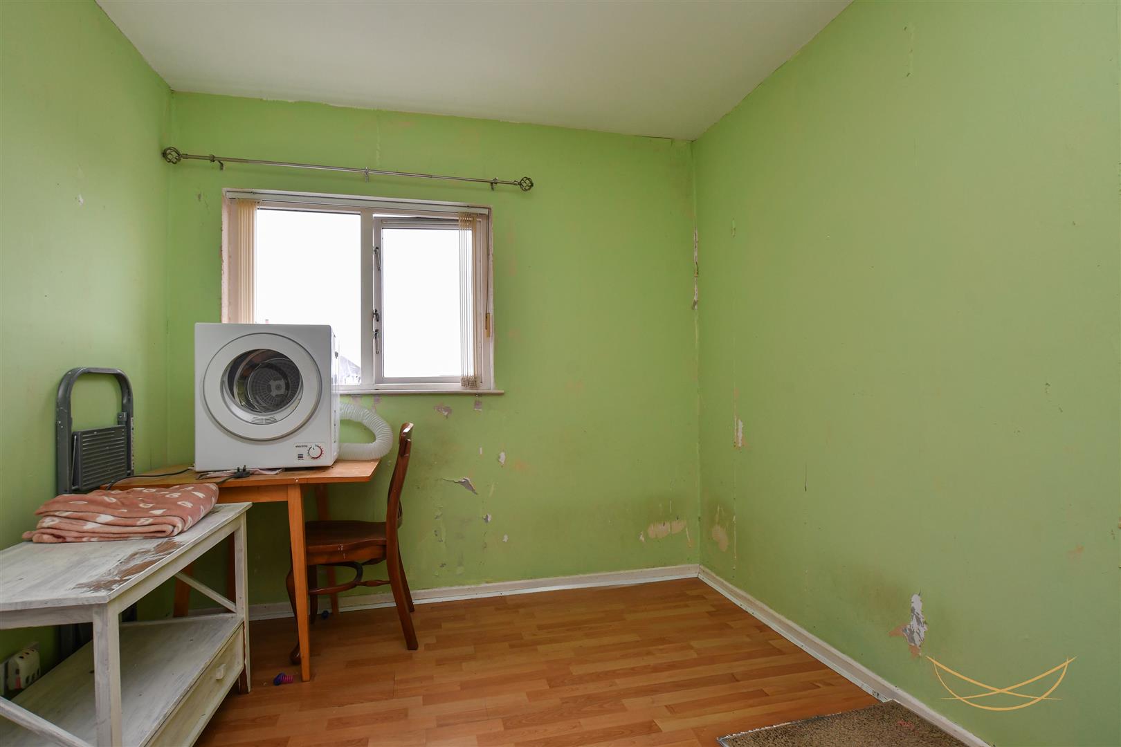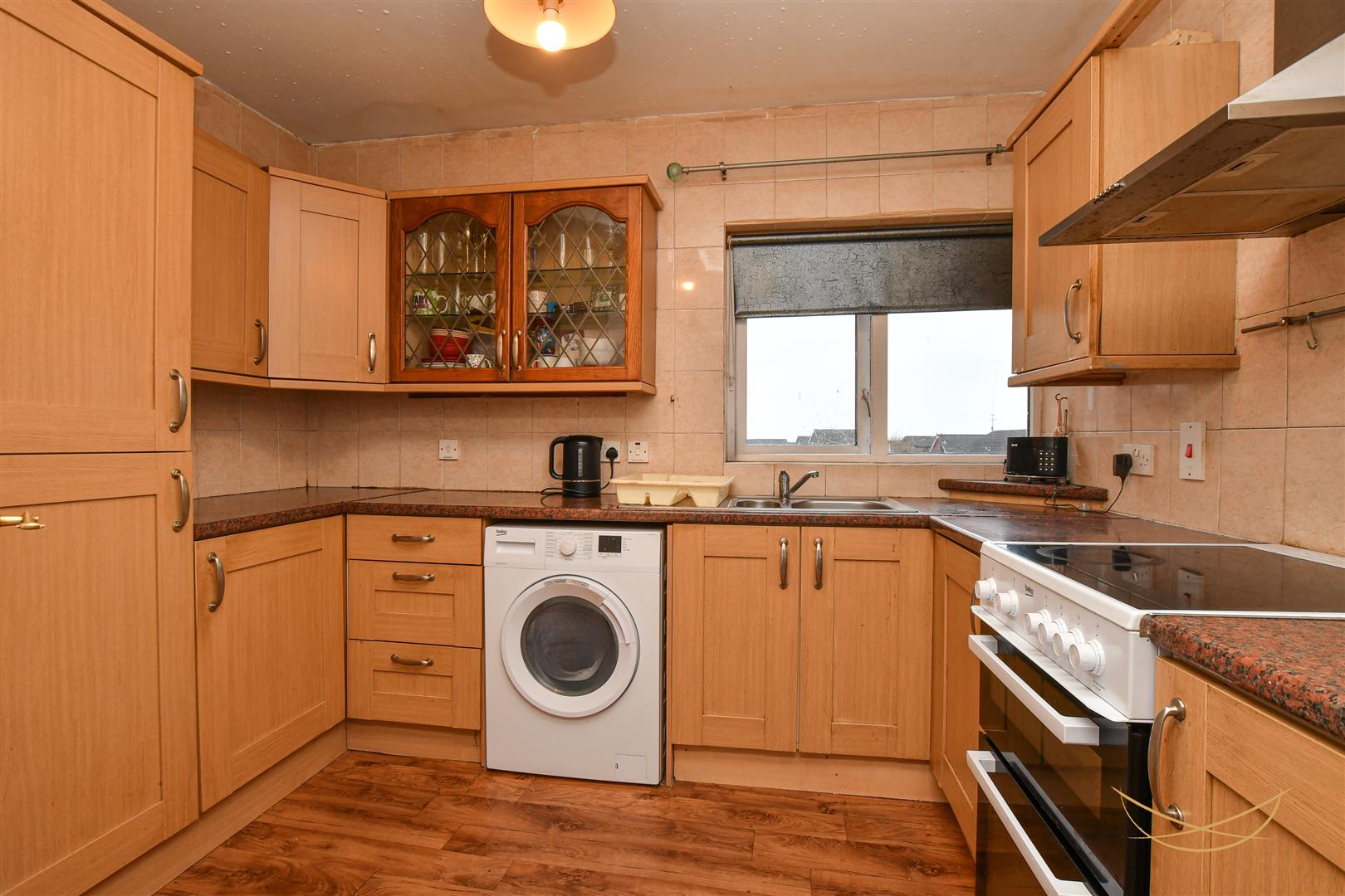 Range of high and low level units with contrasting formica worktops. Stainless steel 1.5 sink bowl unit with drainer and mixer taps. Space for washing machine. Space for oven. Integrated stainless steel extractor fan. Space fridge freezer. Laminate wood effect flooring. Tiled splashback.