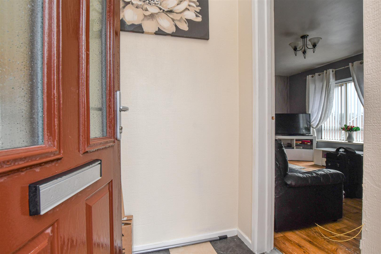 Hardwood front door with glazed feature panels. Tiled flooring.