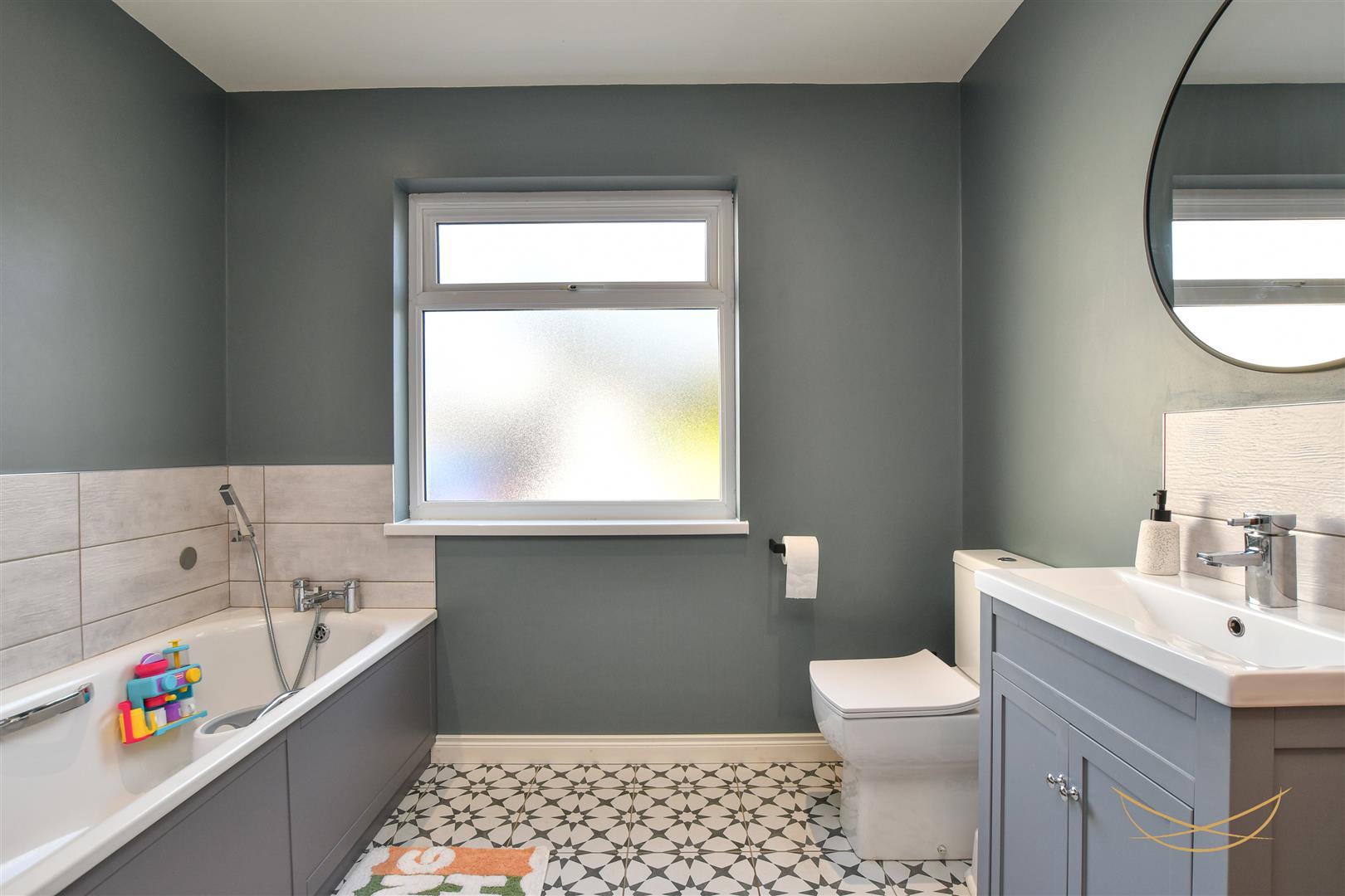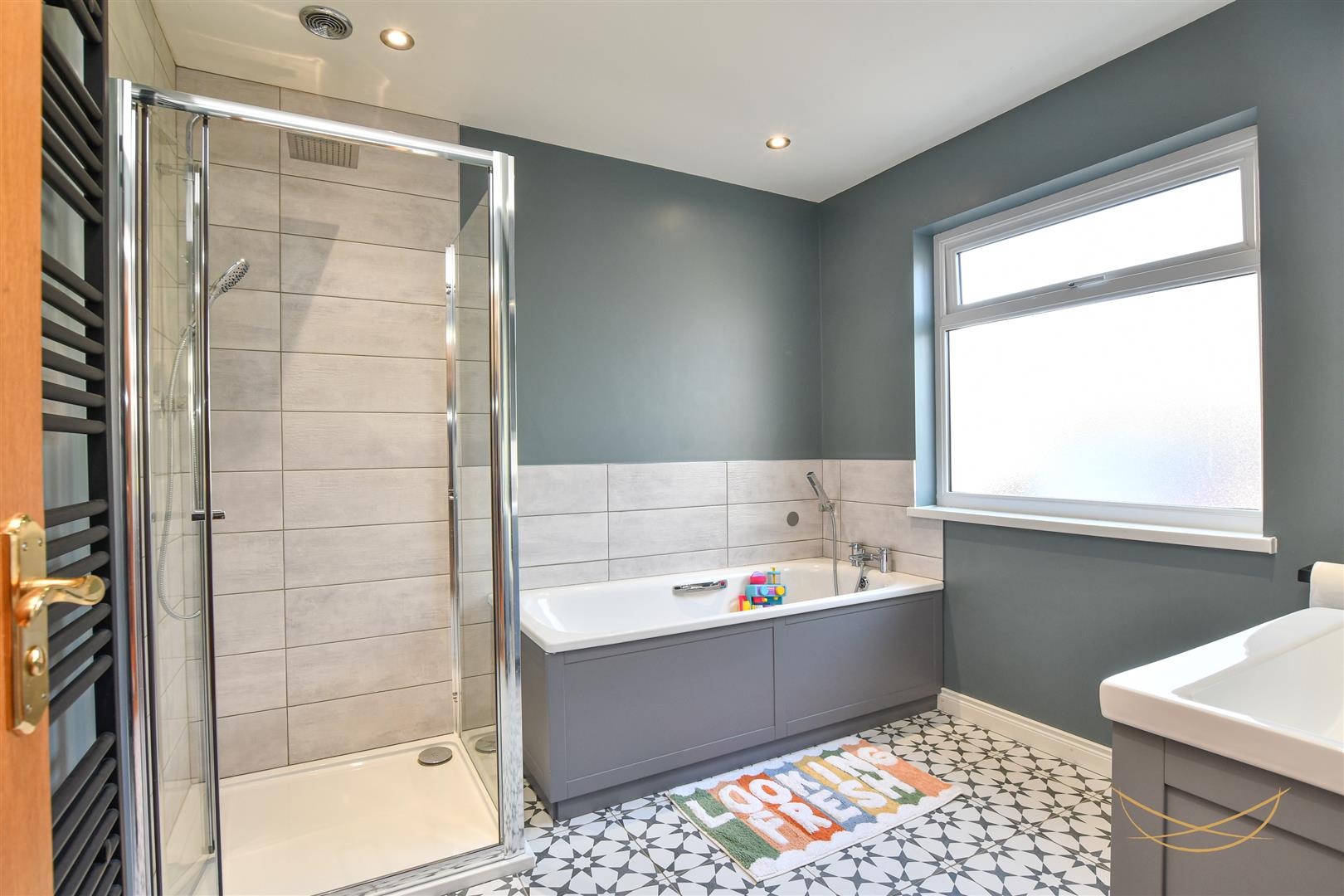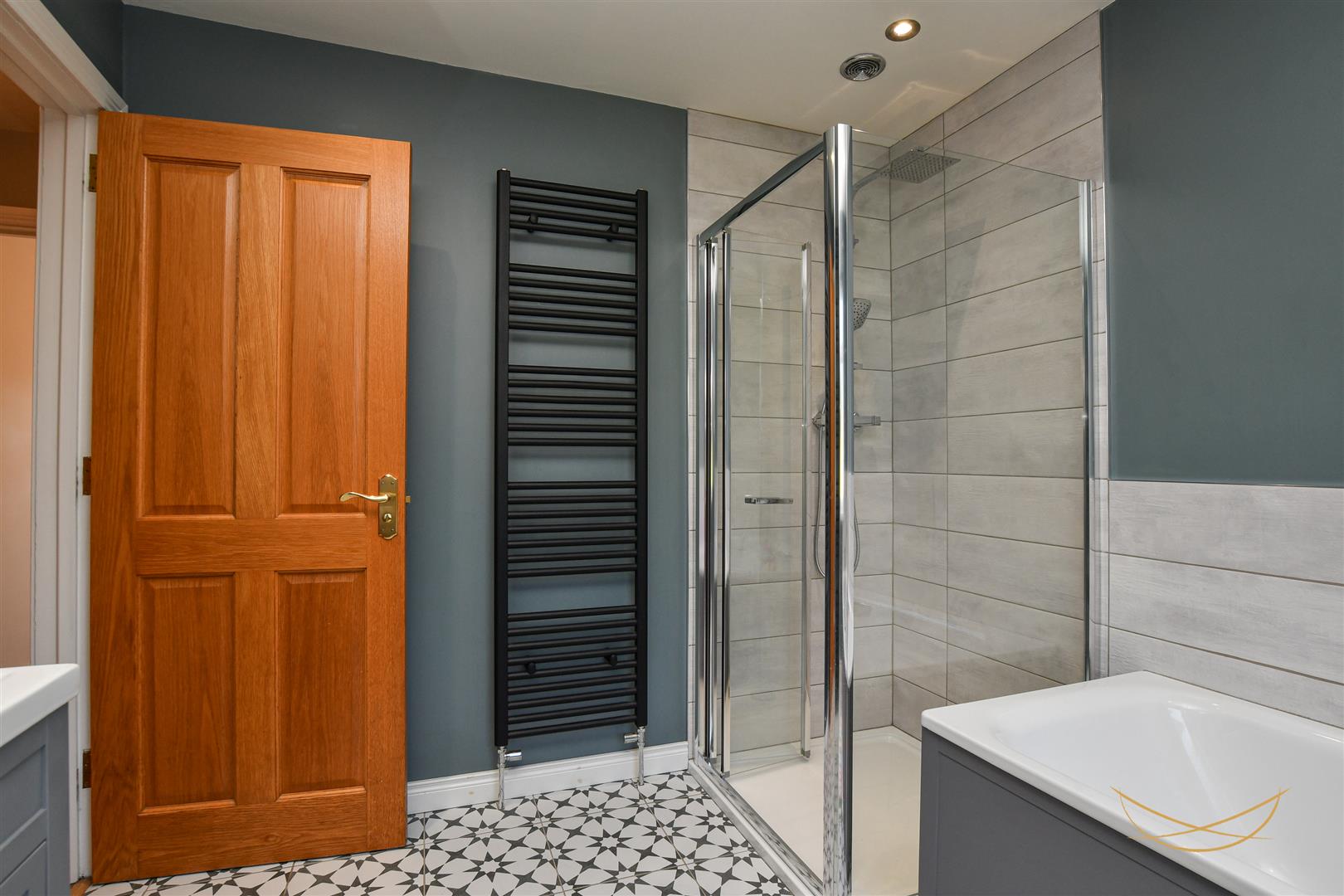 White suite comprising paneled bath with mixer taps hand held shower. Low flush W/C. Vanity style sink unit with mixer taps. Fully enclosed rainfall shower. Heated towel rail. Tiled flooring. Tiled walls. Recessed spotlights.