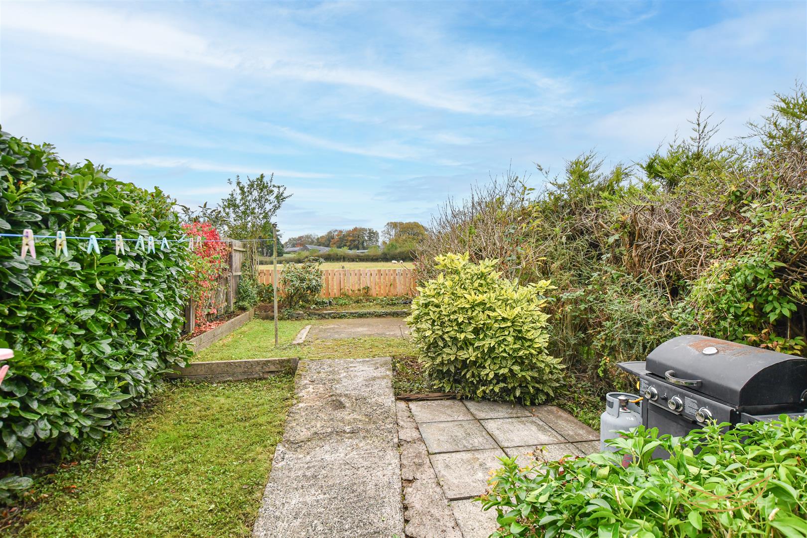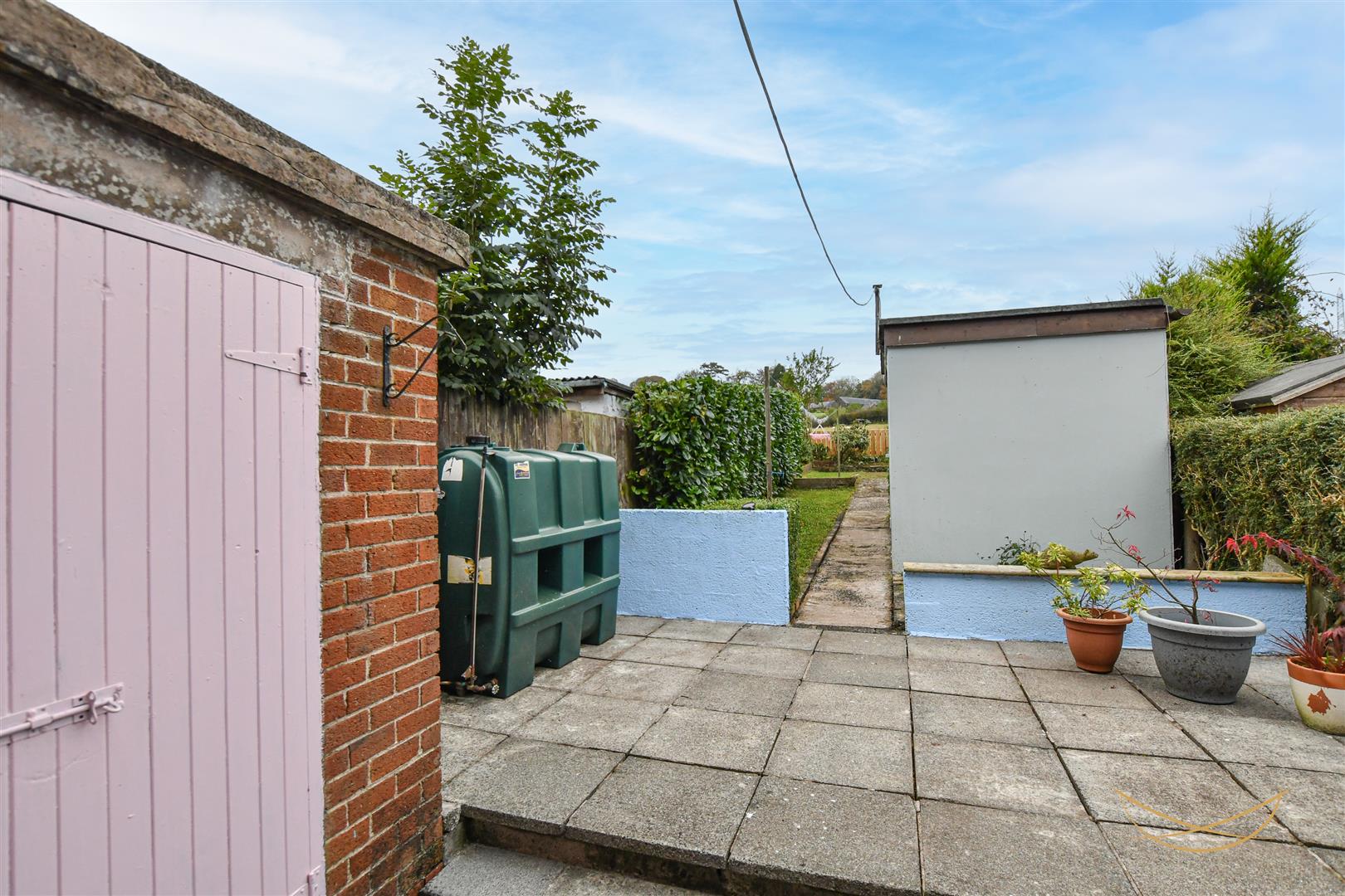 Large rear enclosed garden with laid in lawn bordered by mature shrubbery and paving. Outbuilding for storage. Outdoor tap. Outdoor light.