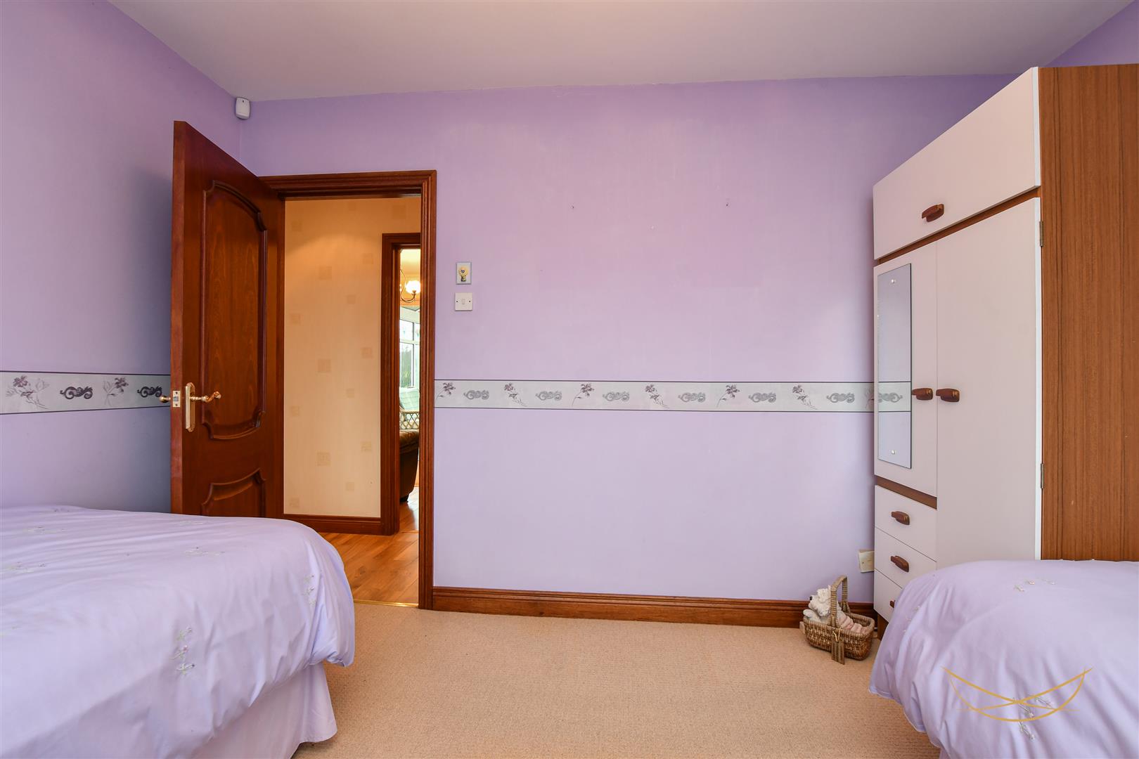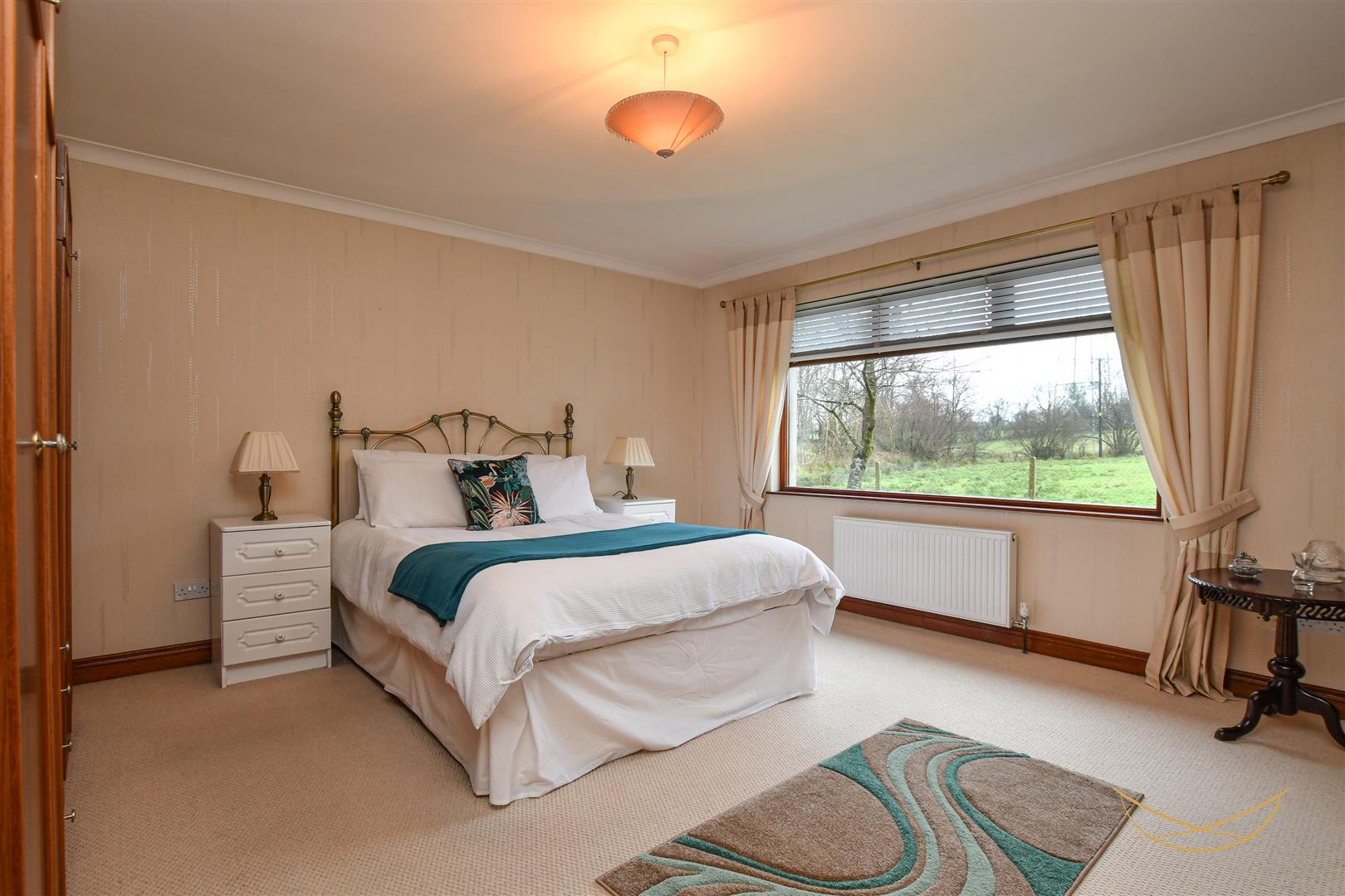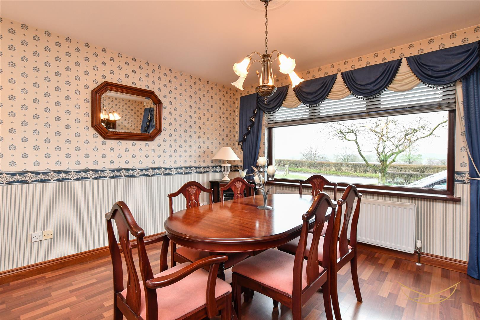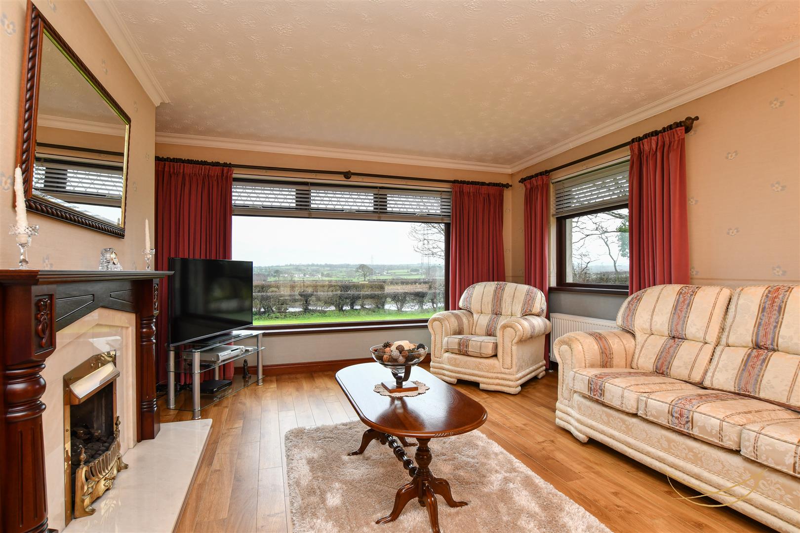 Feature fire with marble inset and matching hearth. Mahogany surround with matching mantle. Laminate wood effect flooring. Cornice ceiling.