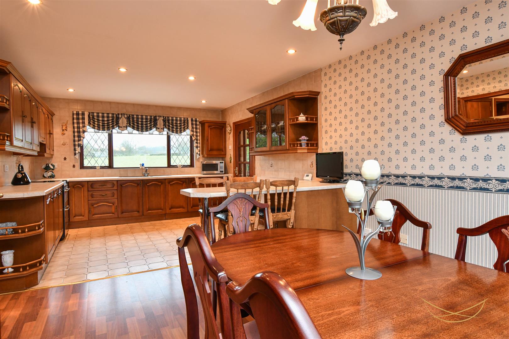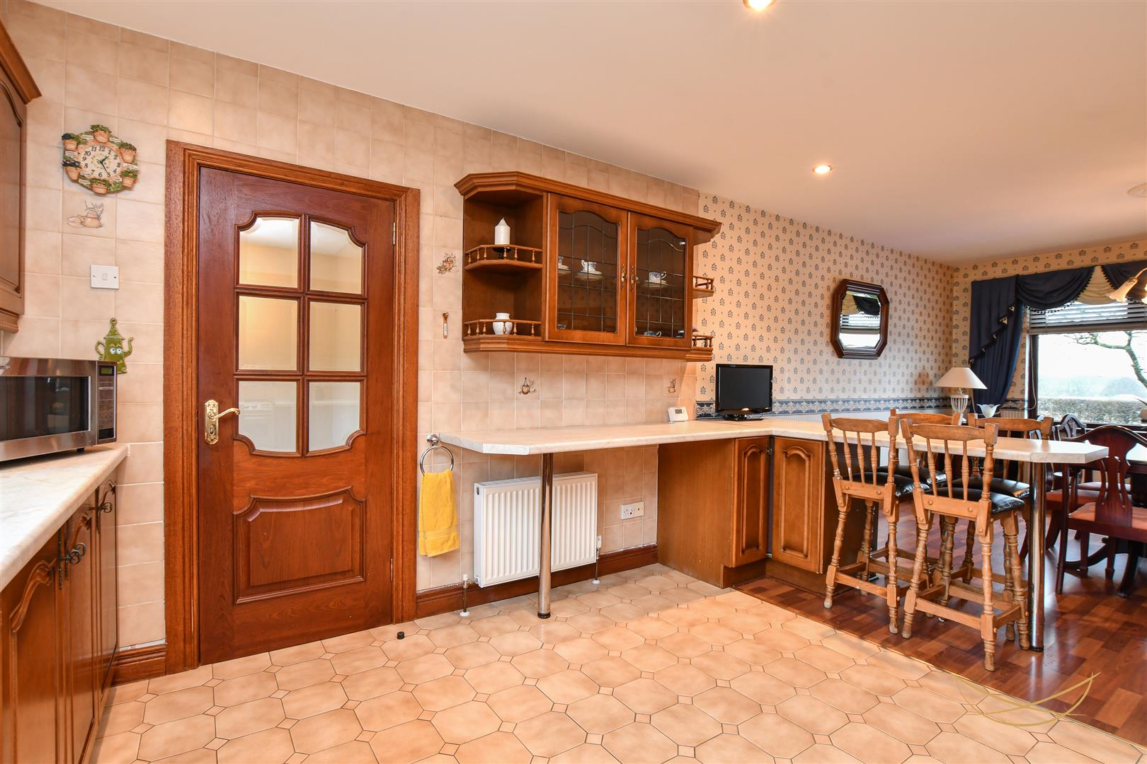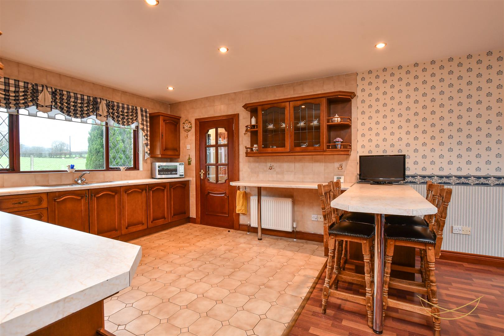 Range of high and low level units with contrasting formica worktops. Stainless steel 1.5 bowl sink unit with drainer and mixer taps. Space for oven. Integrated extractor fan. Glass display cabinets. Breakfast bar area. Tiled flooring. Laminate wood effect flooring. Recessed spotlights.