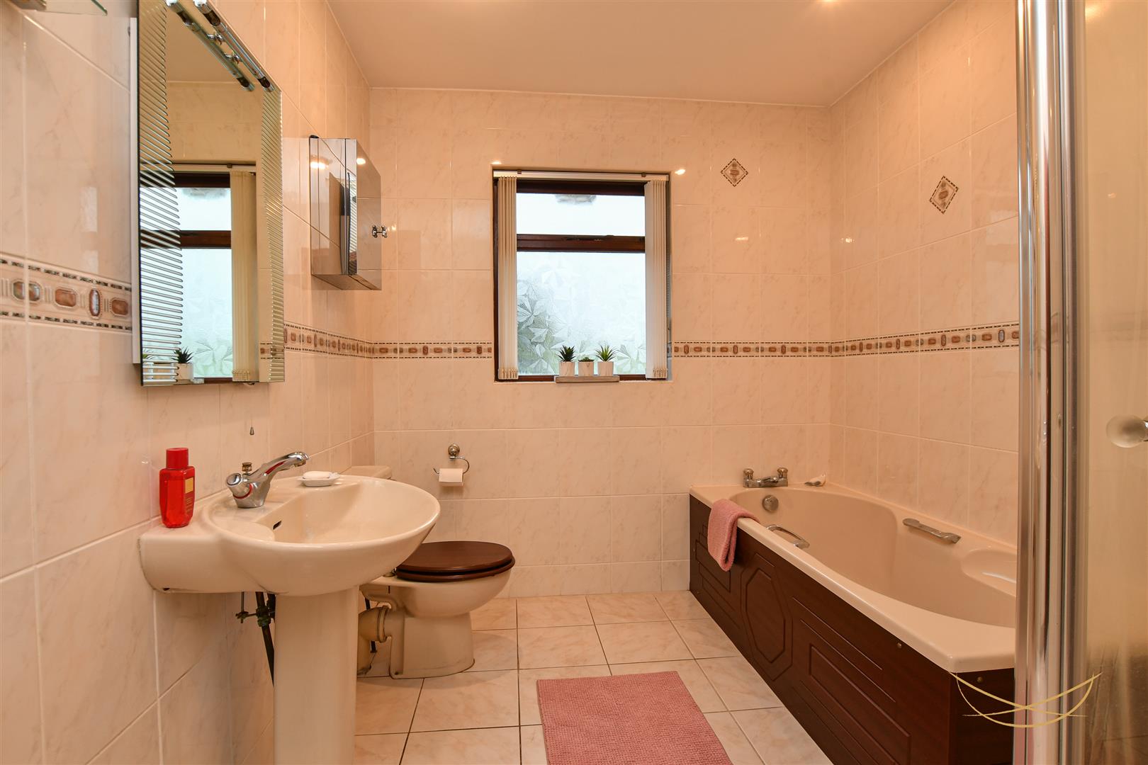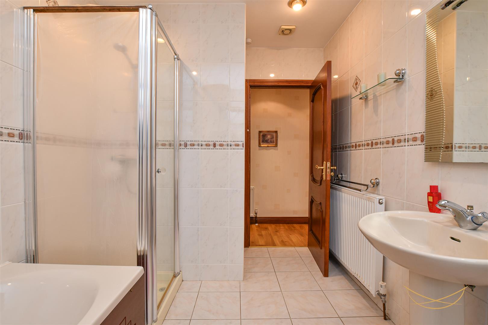 Four piece family bathroom suite comprising paneled bath with mixer taps. Fully enclosed mains shower unit. Pedestal wash hand basin with mixer taps. Low flush W/C. Tiled walls. Tiled flooring. Recessed spotlights.
