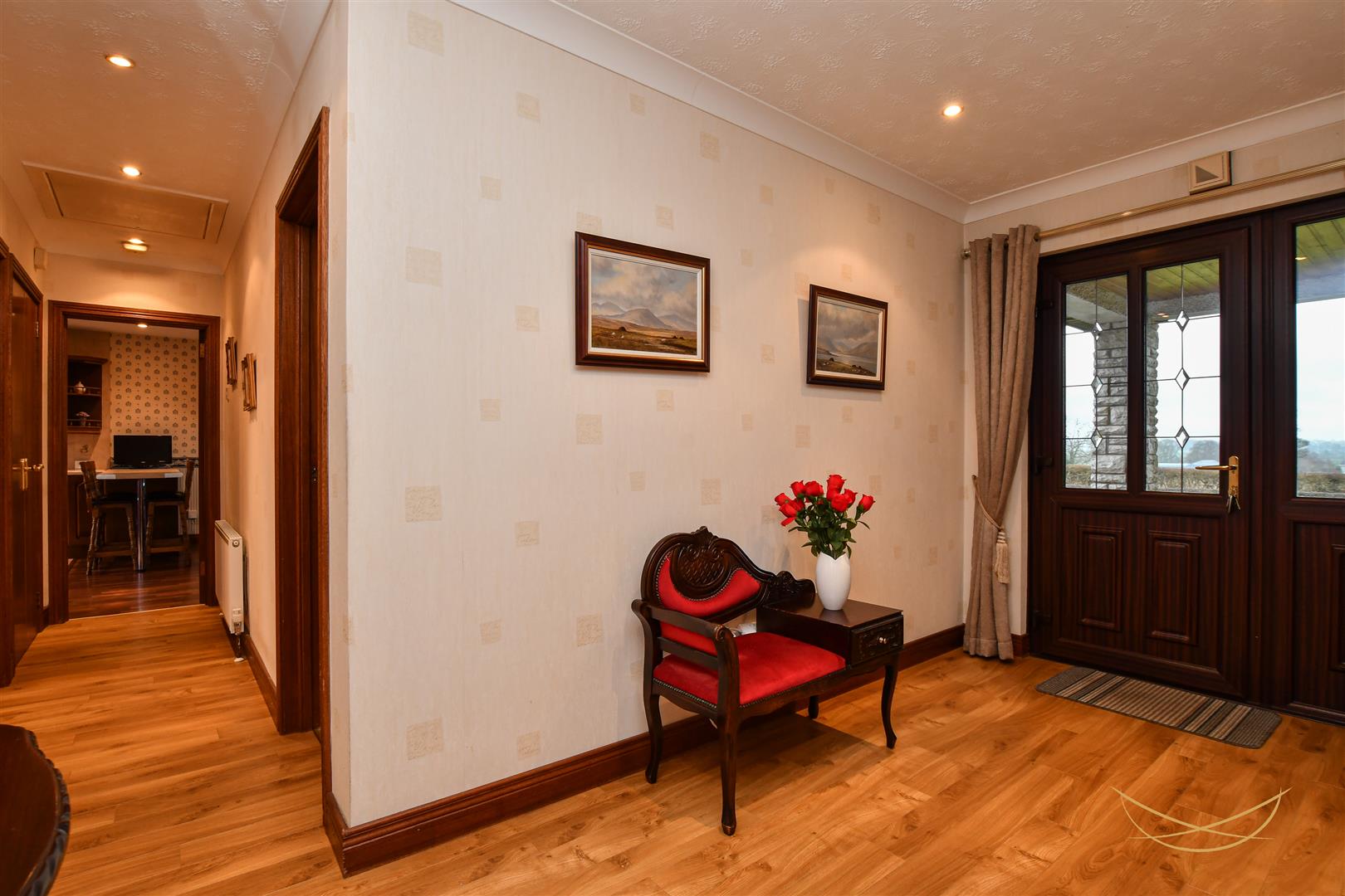 Composite front door with glazed feature panels. Laminate wood effect flooring. Cornice ceiling. Access to storage. Access to roofspace.