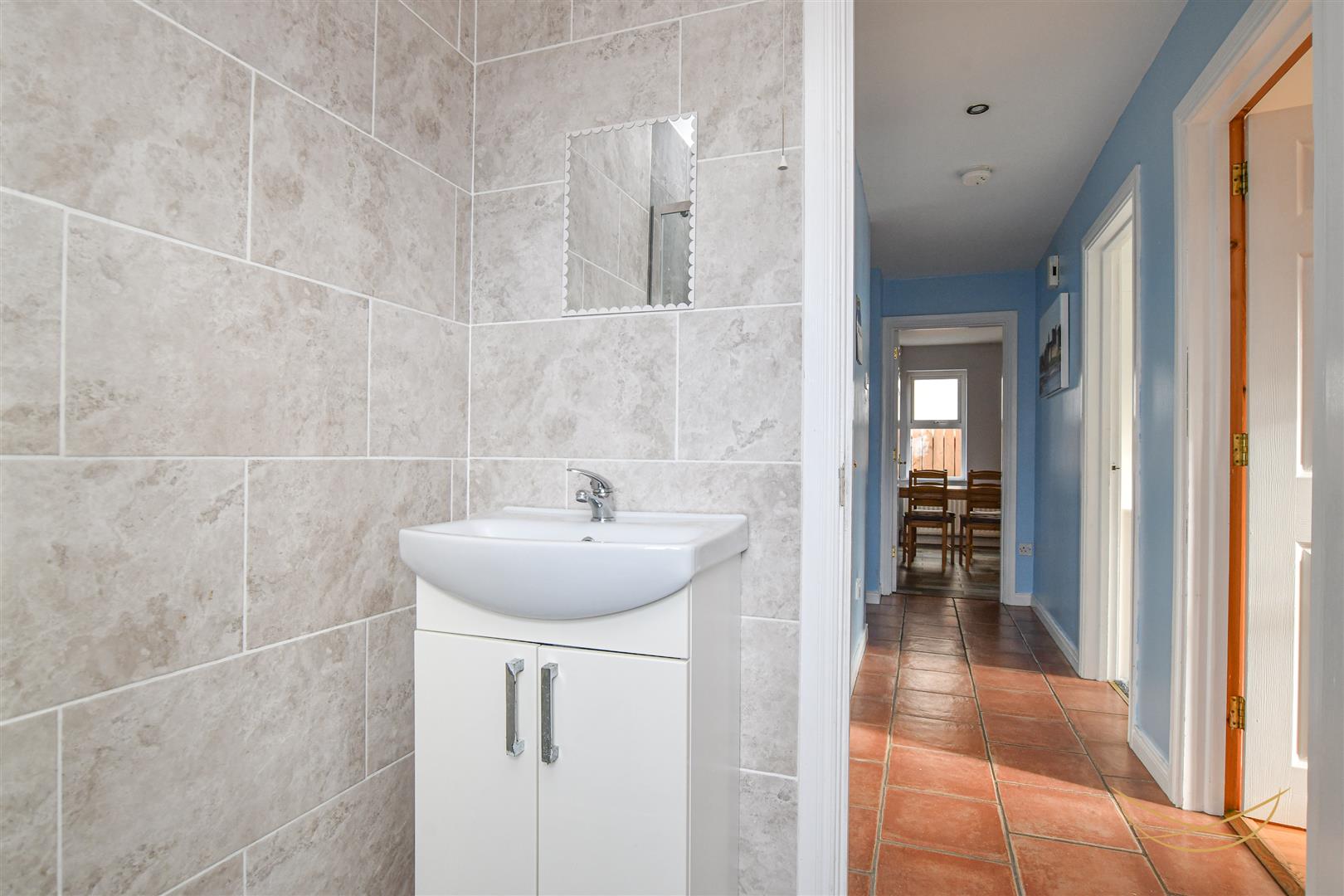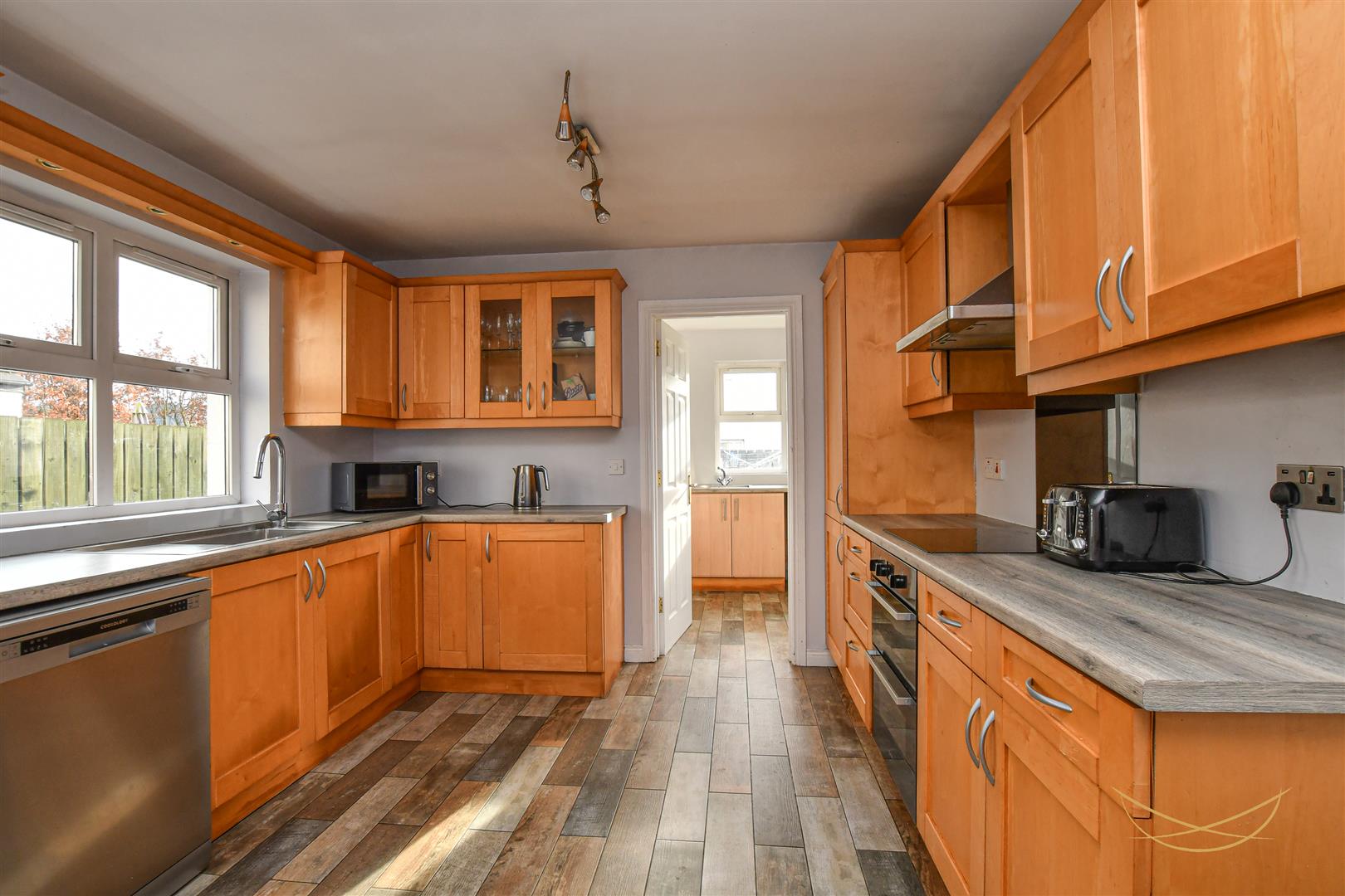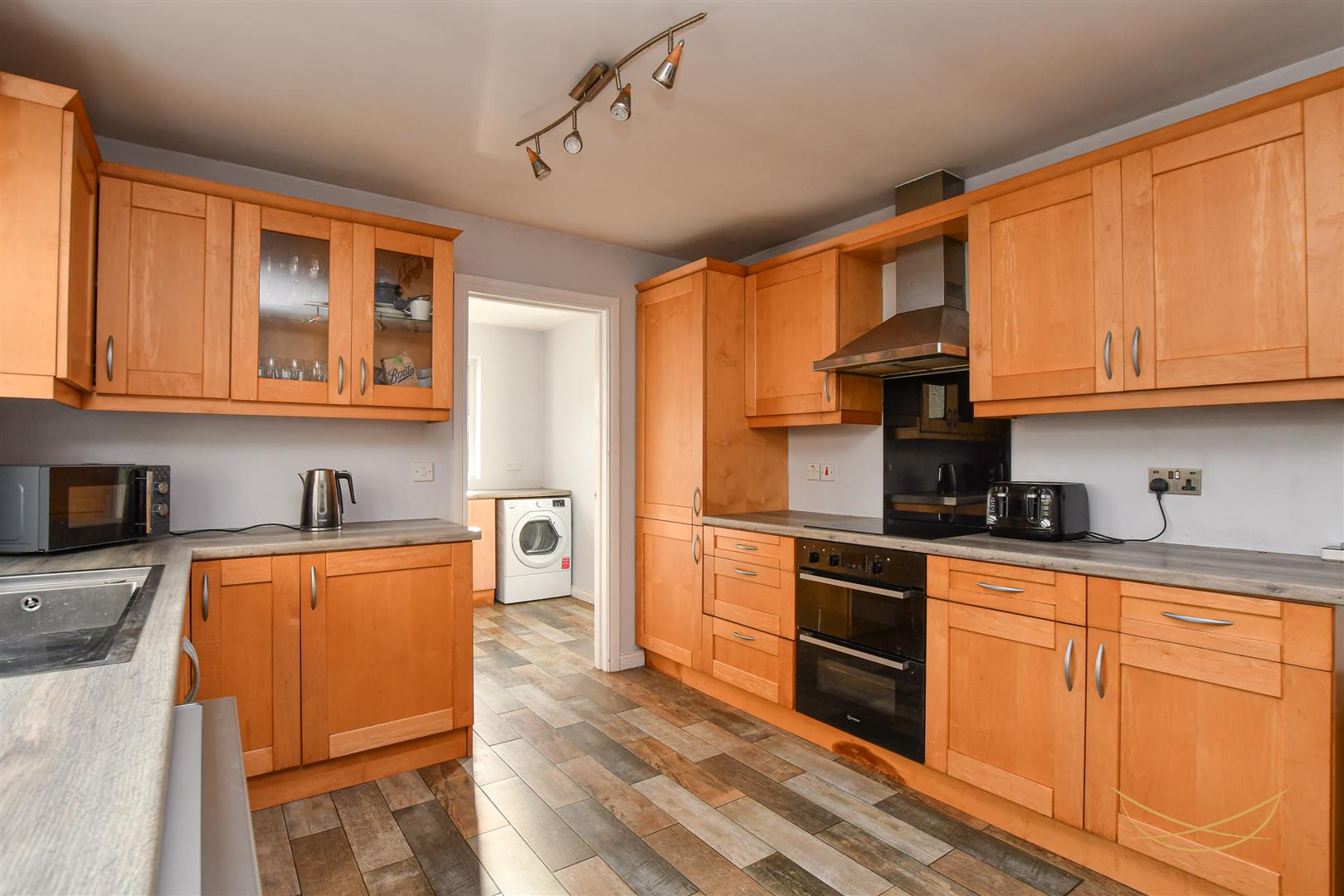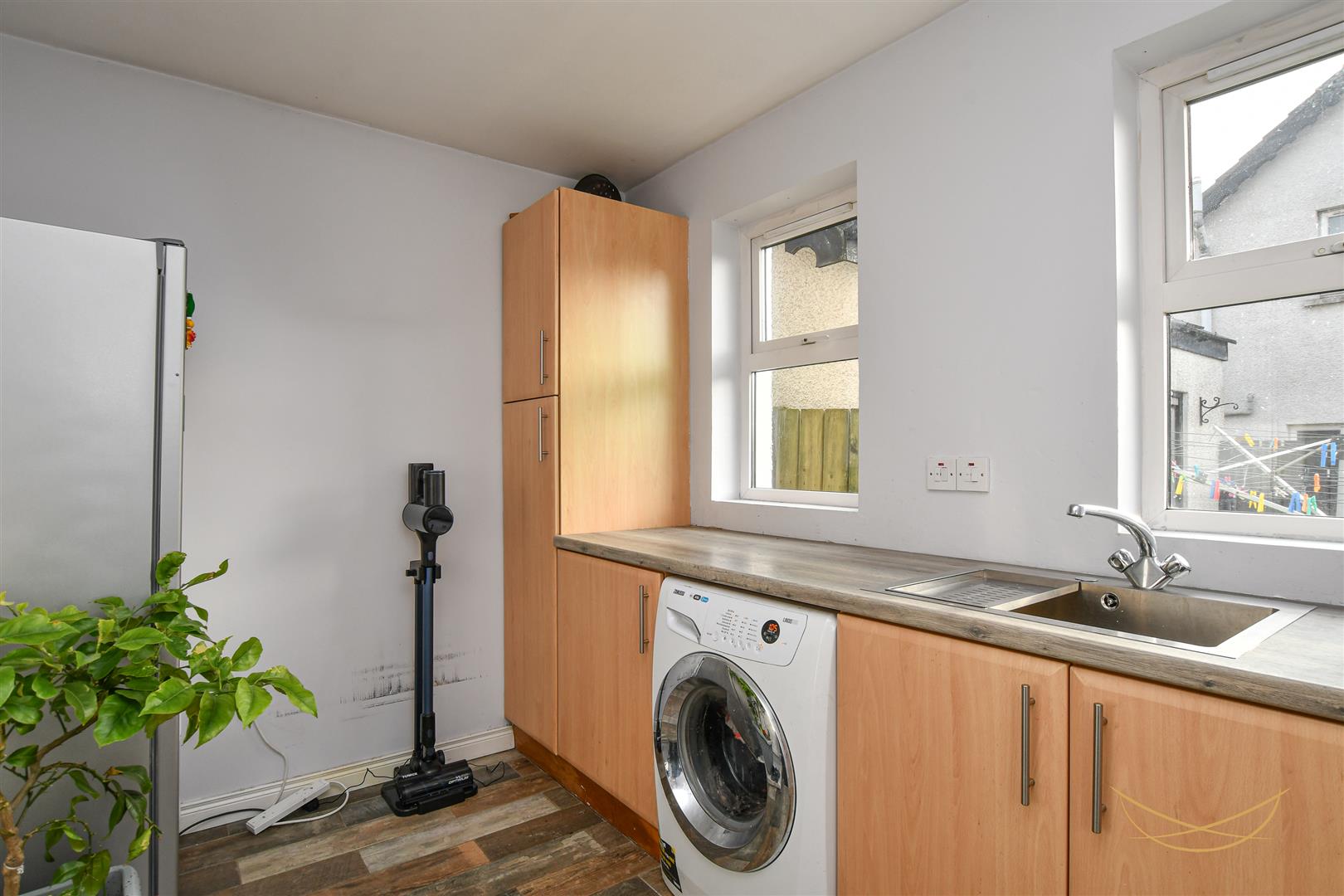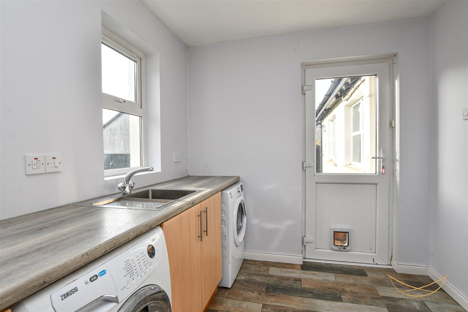 Range of low level units with contrasting formica worktops. Stainless steel sink unit with drainer and mixer taps. Space for washing machine. Space for tumble dryer. Laminate wood effect flooring. Access to rear garden.