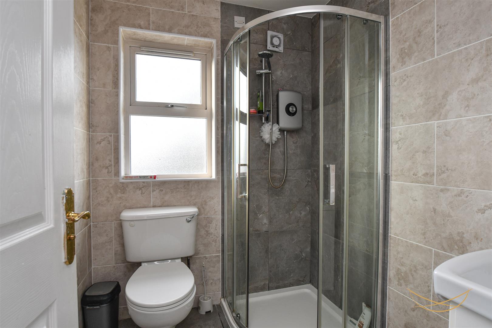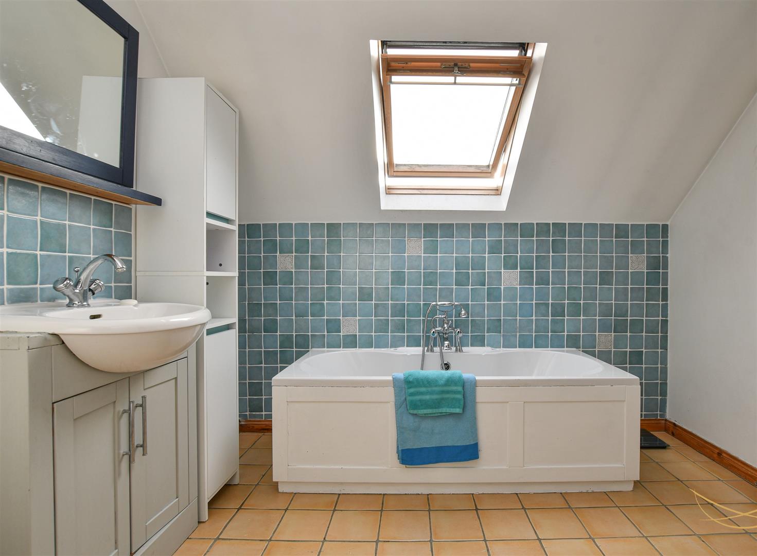 White suite comprising paneled bath with mixer taps and hand held shower. Low flush W/C. Vanity style sink unit with mixer taps. Fully enclosed mains shower unit. Tiled flooring. Tiled walls.
