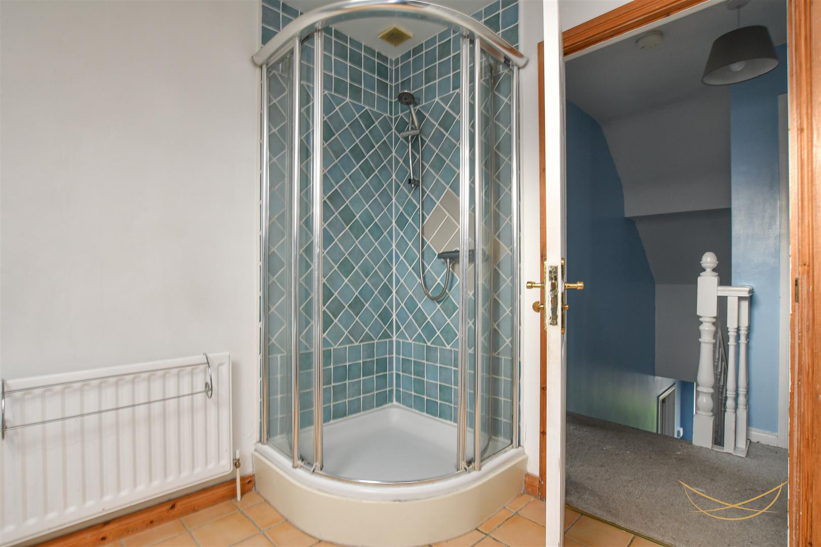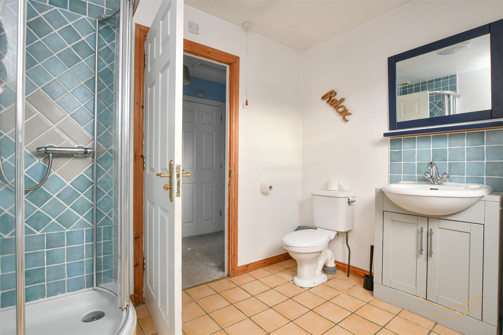White suite comprising low flush W/C. Vanity style with mixer taps. Fully enclosed electric shower. Tiled flooring. Tiled walls.