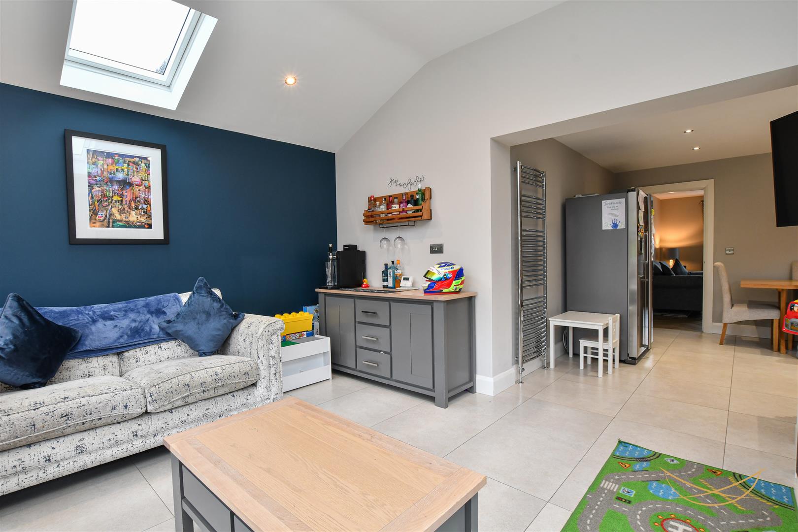 Vaulted ceiling with recessed spotlights. Double patio doors leading to rear garden. Tiled flooring.