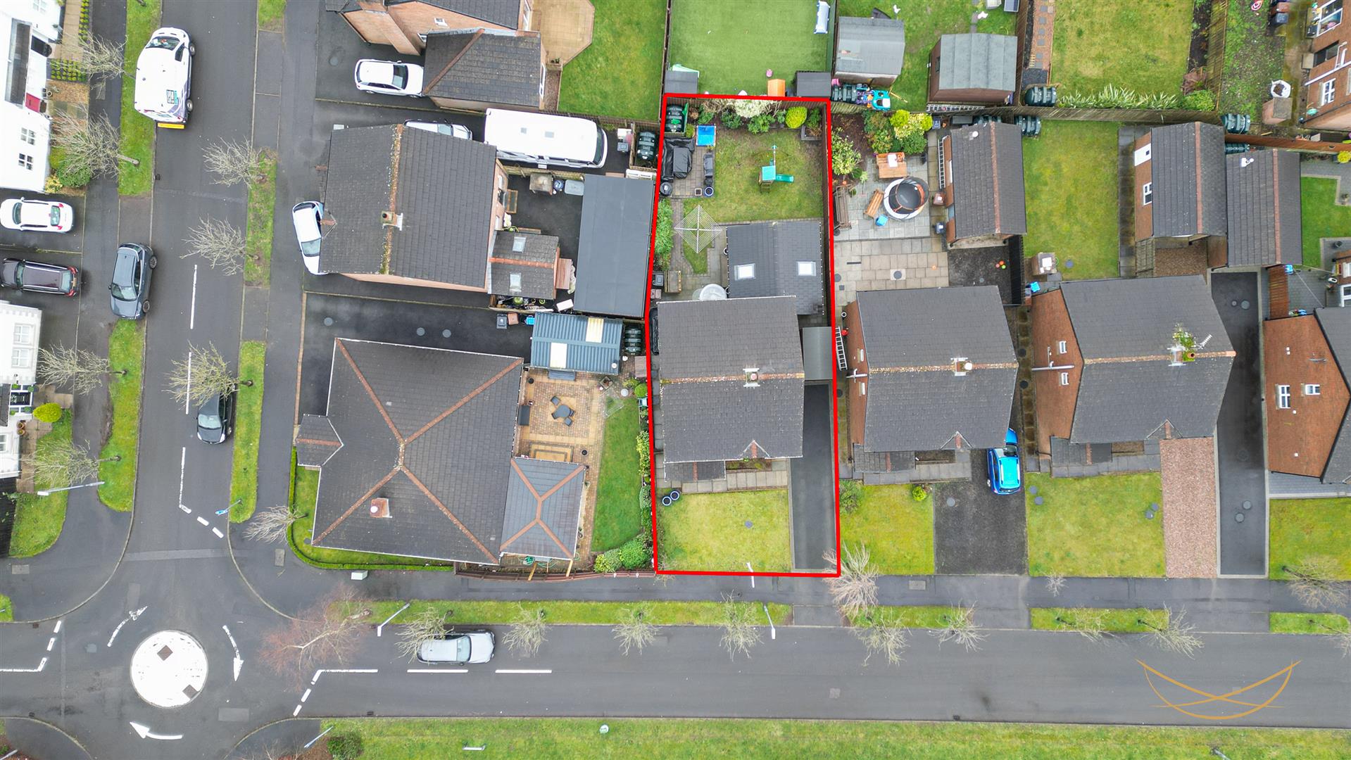 Rear laid in lawn bordered by mature shrubbery. Feature paving. Outdoor tap. Outdoor lighting.