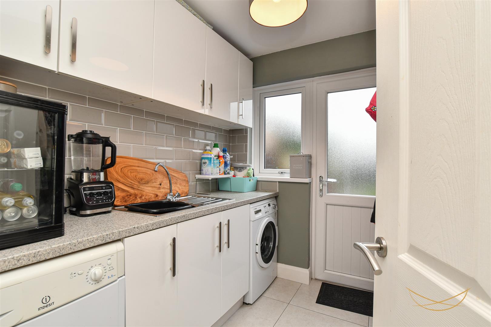 Range of high and low level units with contrasting formica worktops. Stainless steel sink unit with drainer and mixer taps. Tiled splashback. Tiled flooring. Access to rear garden.
