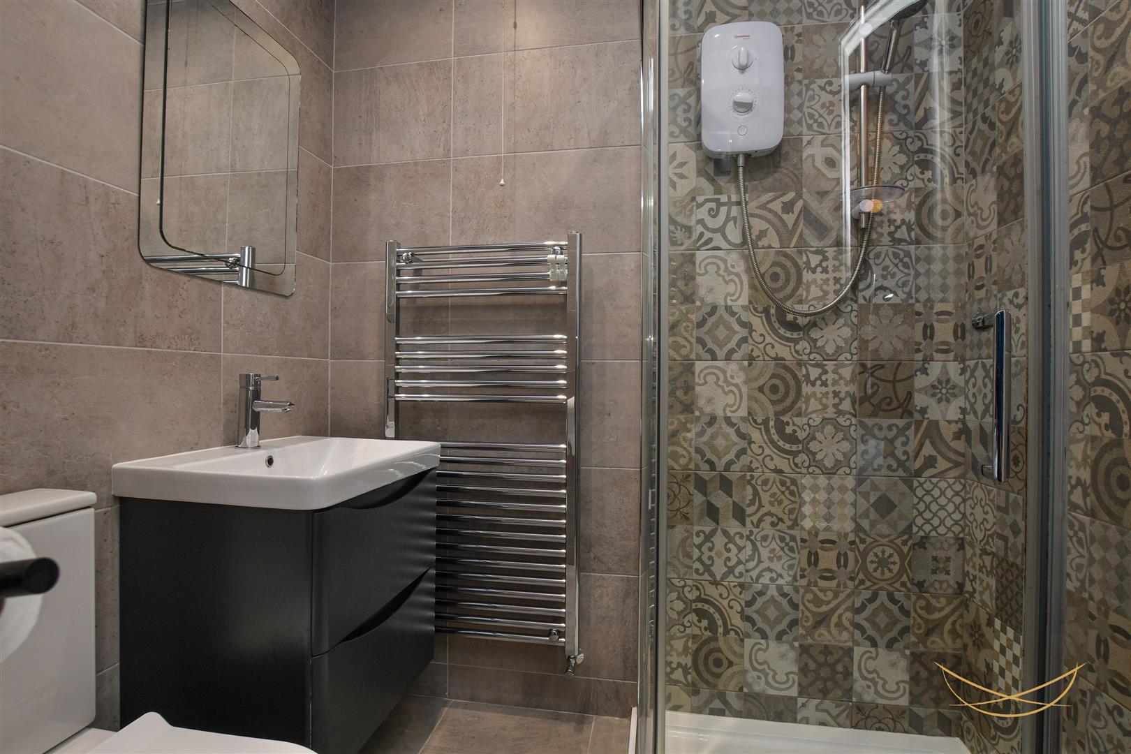 White suite comprising corner electric shower. Low flush W/C. Vanity style sink unit with mixer taps. Tiled walls. Tiled flooring.