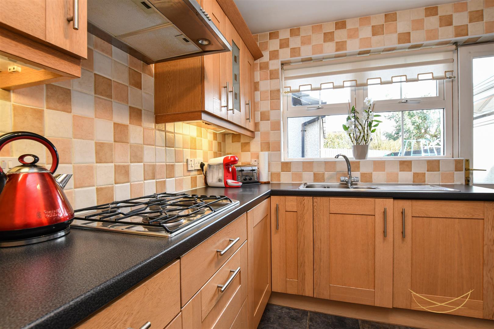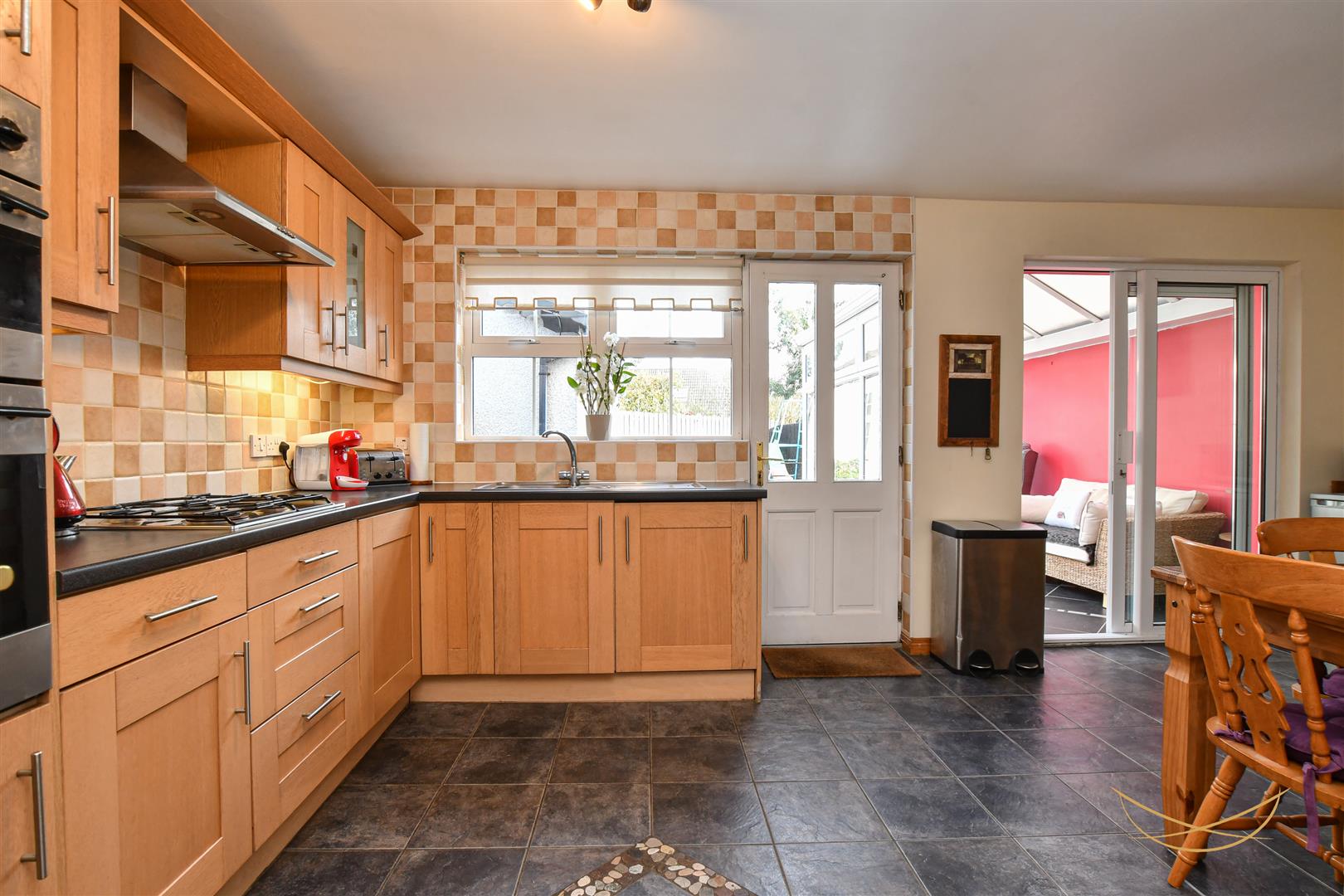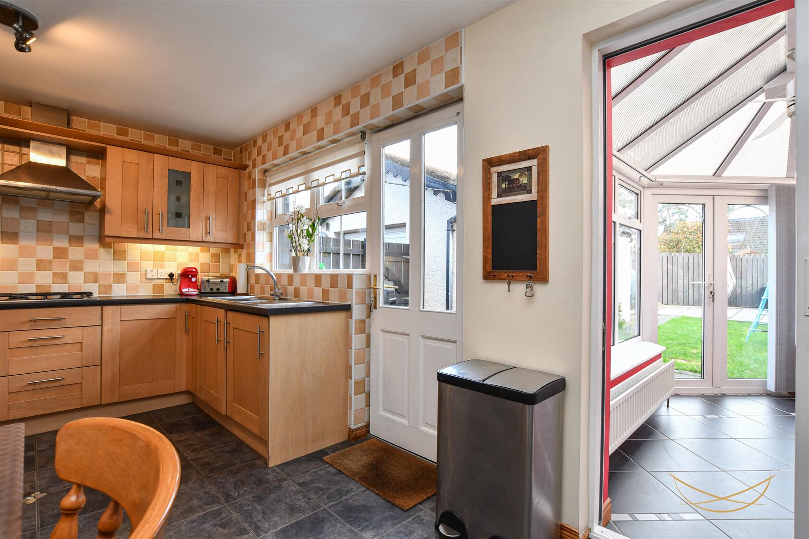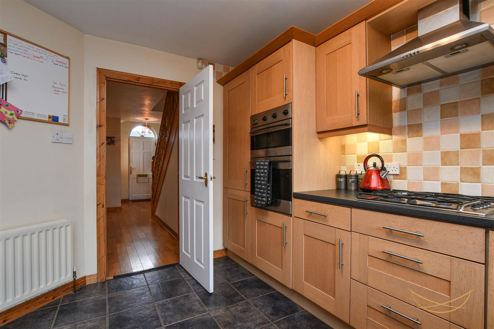 Range of high and low level units with contrasting formica worktops. Integrated eye level oven and grill. Stainless stink 1.5 bowl unit with drainer and mixer taps. Integrated gas hob. Stainless steel sink unit. Display cabinet. Partially tiled walls. Tiled flooring. Sliding door to conservatory.