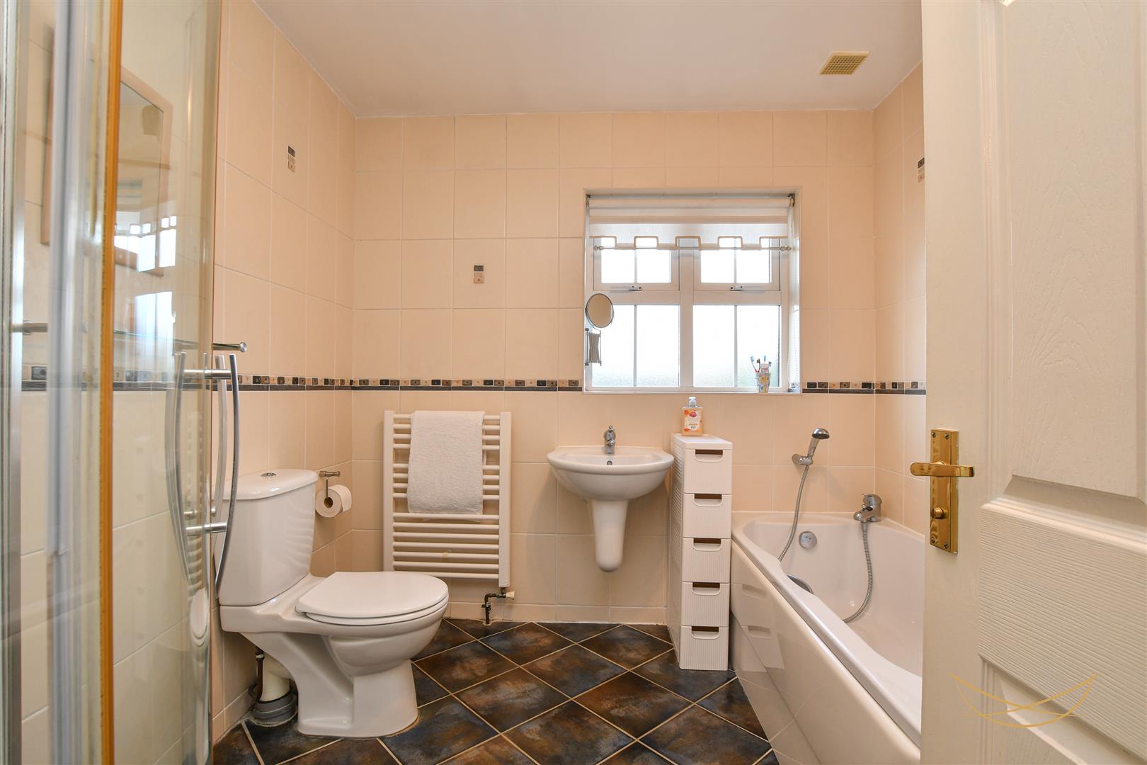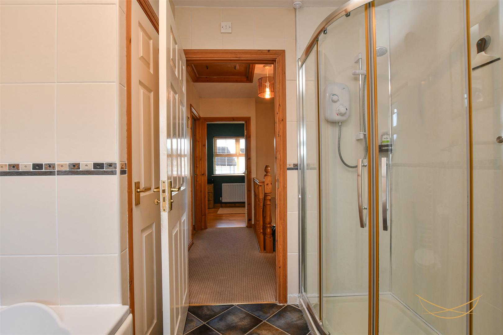 White suite comprising a paneled bath, mixer taps and hand held shower. Fully enclosed corner electric shower. Semi pedestal wash hand basin with mixer taps. Low flush W/C. Heated towel rail. Tiled flooring. Tiled walls. Access to storage.