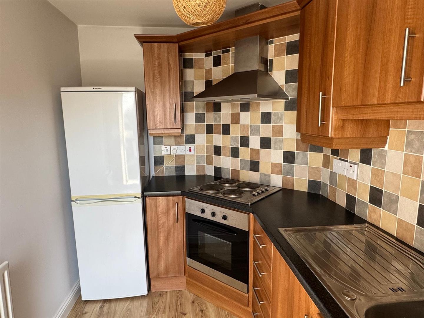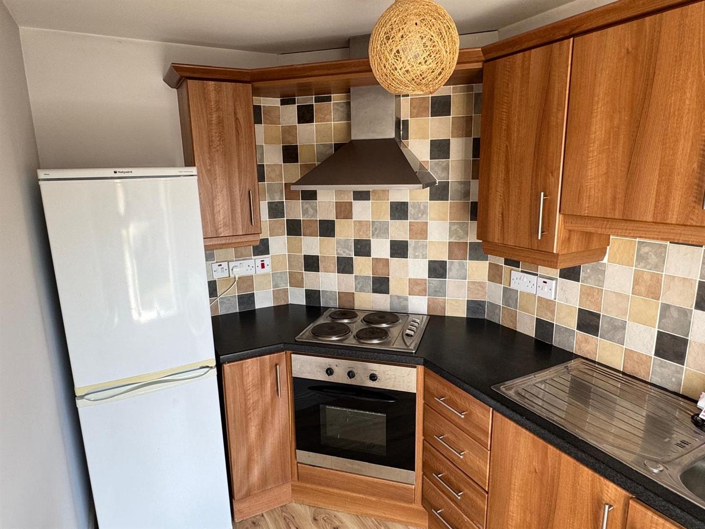 Range of high and low level units with formica worktops. Stainless steel sink unit with drainer and mixer taps. Integrated electric oven. Integrated electric oven. Stainless steel extractor fan. Space for washing machine. Laminate wood effect flooring. Tiled splashback.