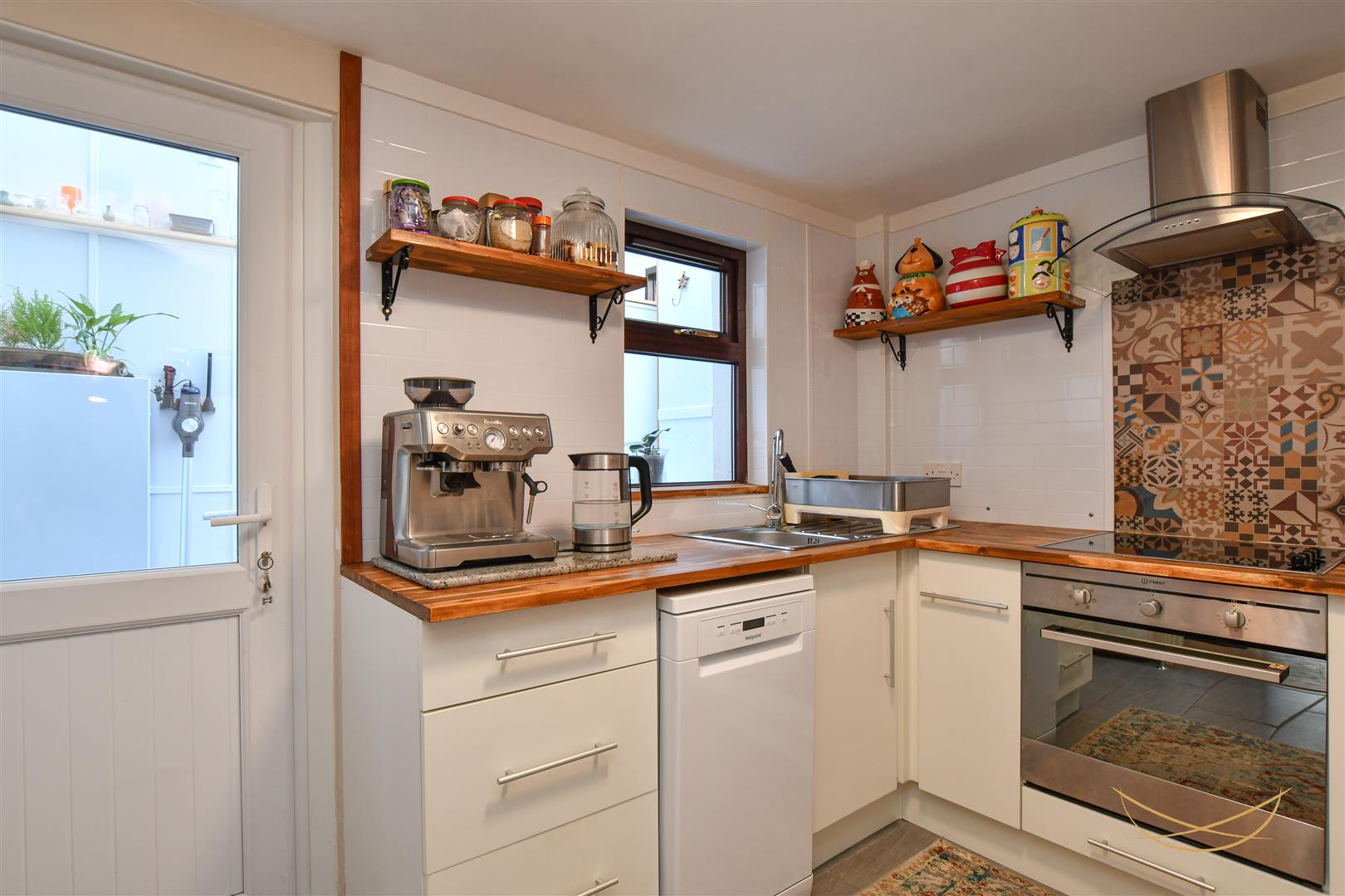 Range of low level units with contrasting worktops. Integrated electric oven and hob. Stainless steel extractor fan, Stainless steel sink unit with drainer and mixer taps. Space for dishwasher. Tiled splashback. Tiled flooring. Access to storage. Access to rear garden.