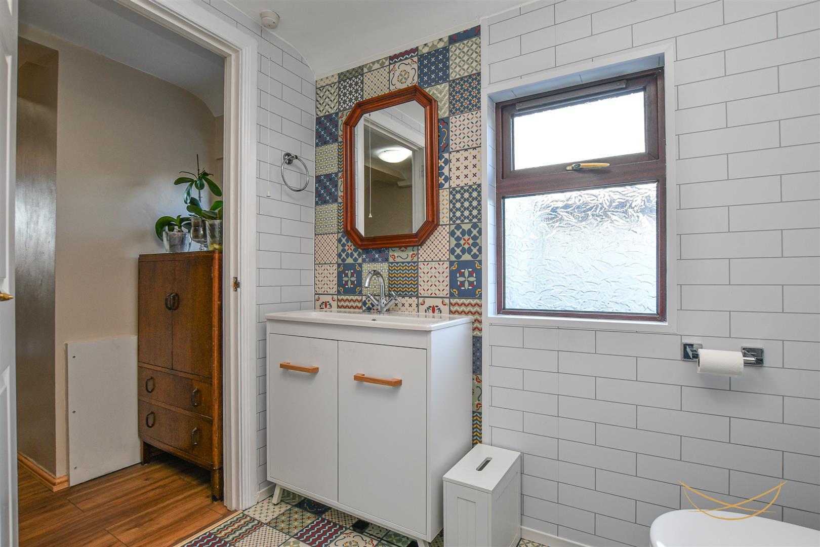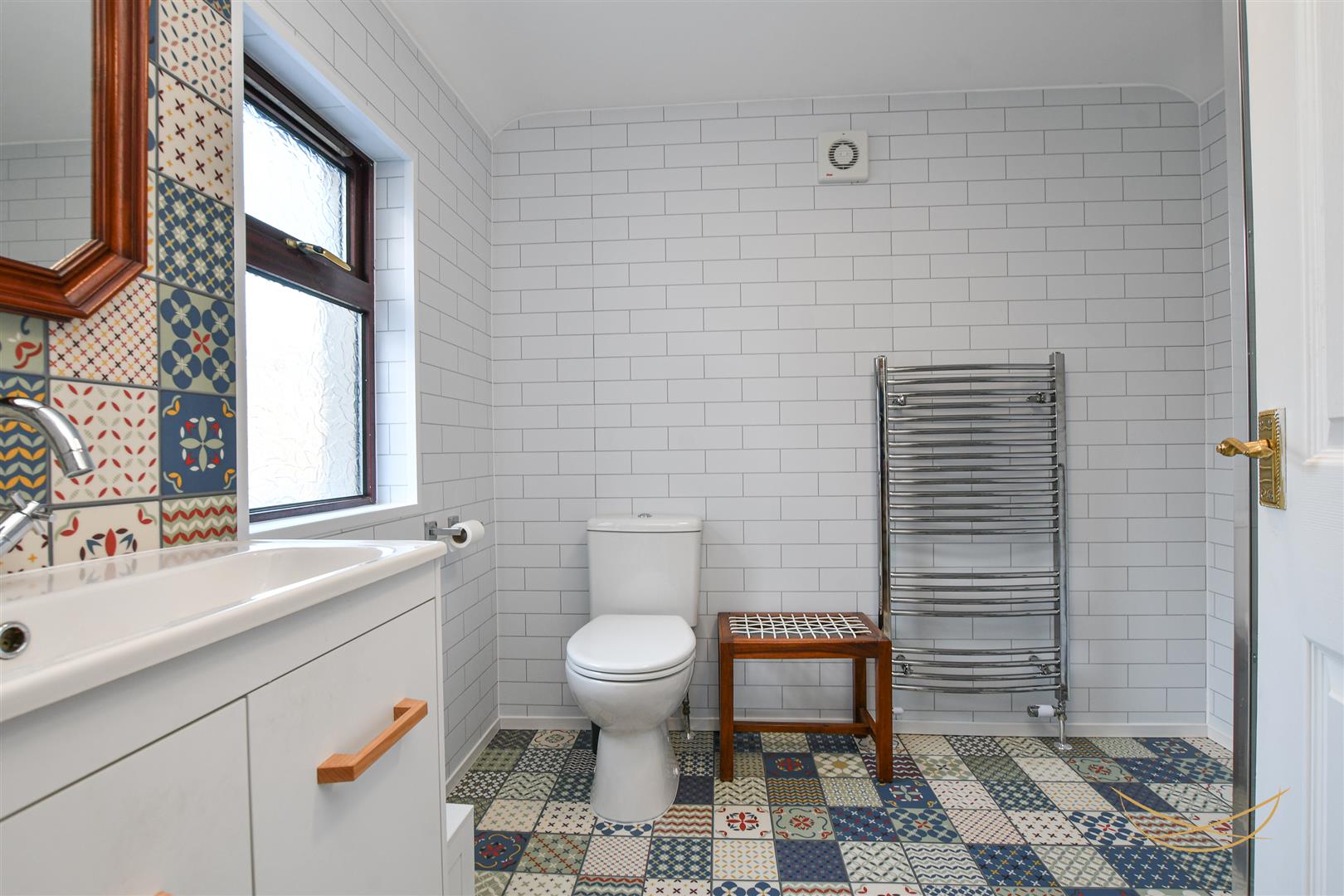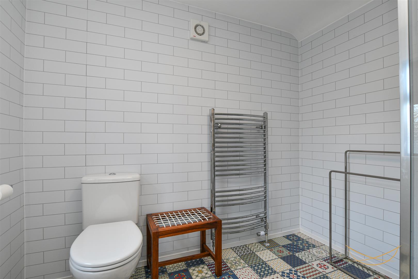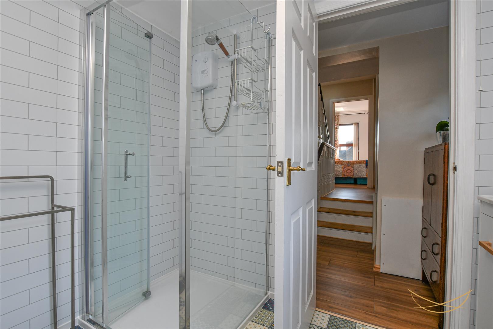 White suite comprising fully enclosed mains shower. Vanity style sink unit with mixer taps. Low flush W/C. Heated chrome towel rail. Tiled flooring. Tiled walls.