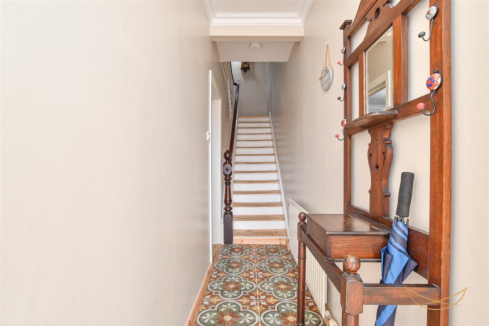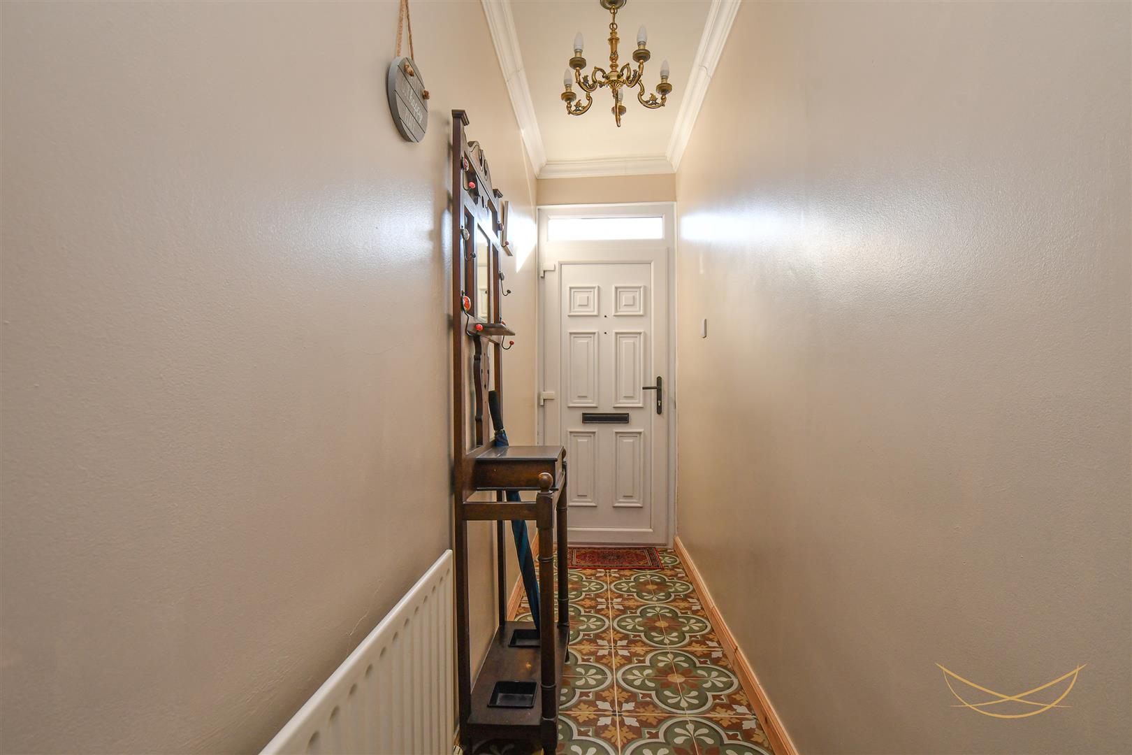 uPVC front door with overhead glazed panel. Ceramic tiled flooring. Cornice ceiling.