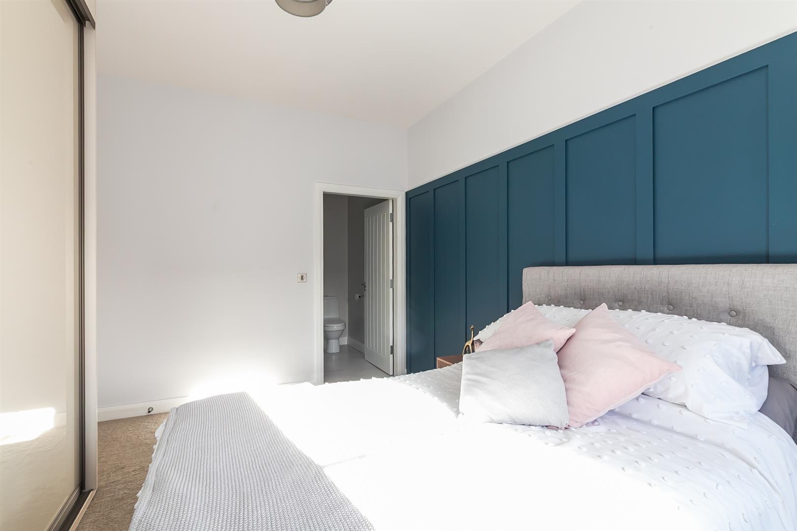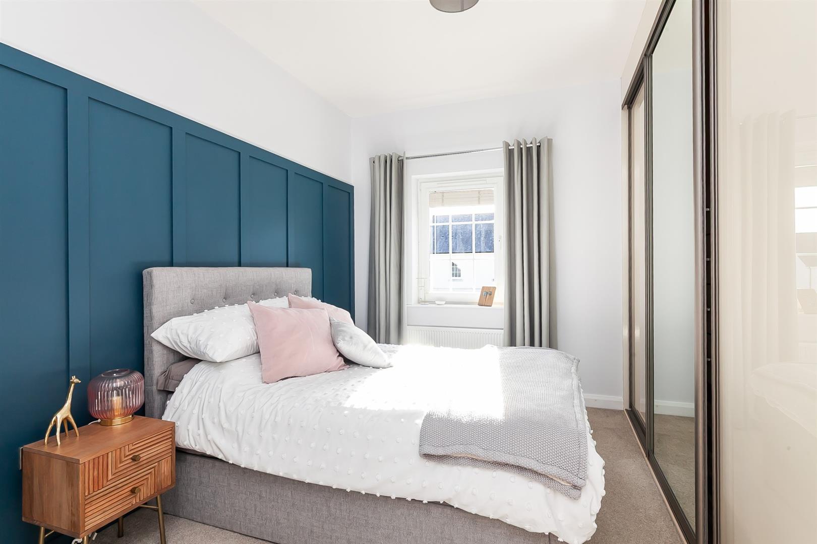 Fitted wardrobes in glass and mirror panelled sliding doors. Panelled feature wall.