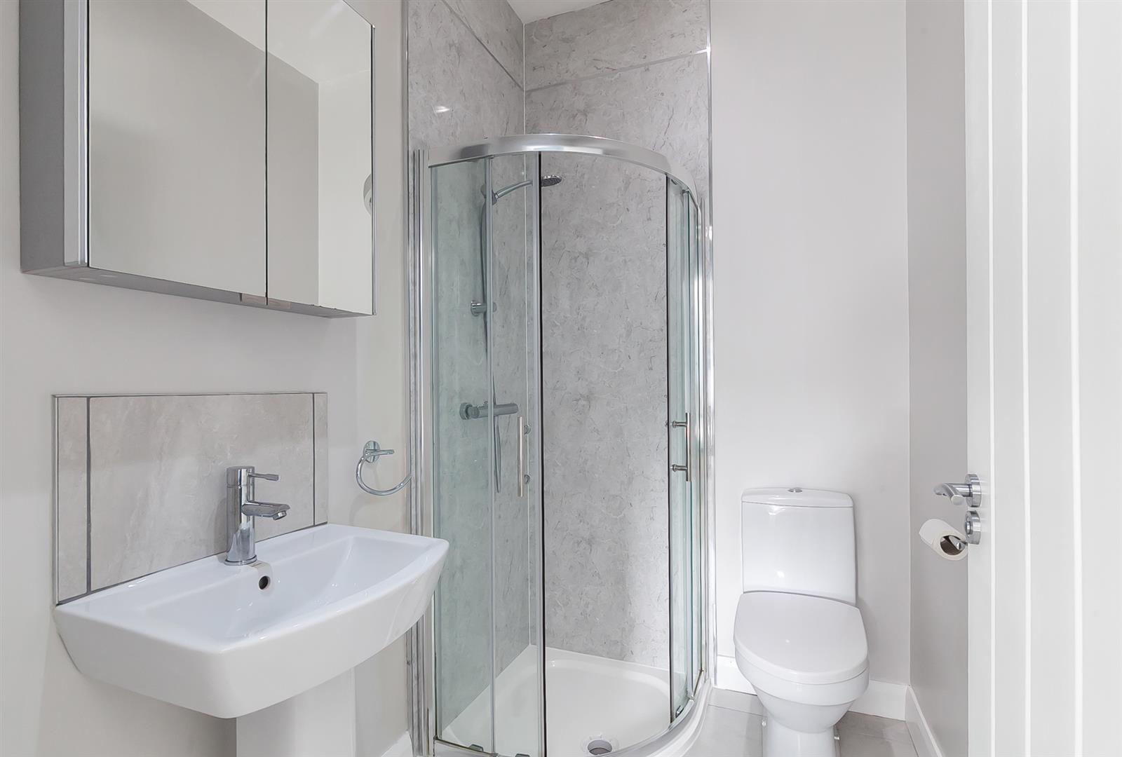 Contemporary, white, three piece suite comprising panelled shower enclosure, pedestal wash hand basin and WC. Thermostat controlled main shower unit. Splashback tiling to sink. Tiled floor.