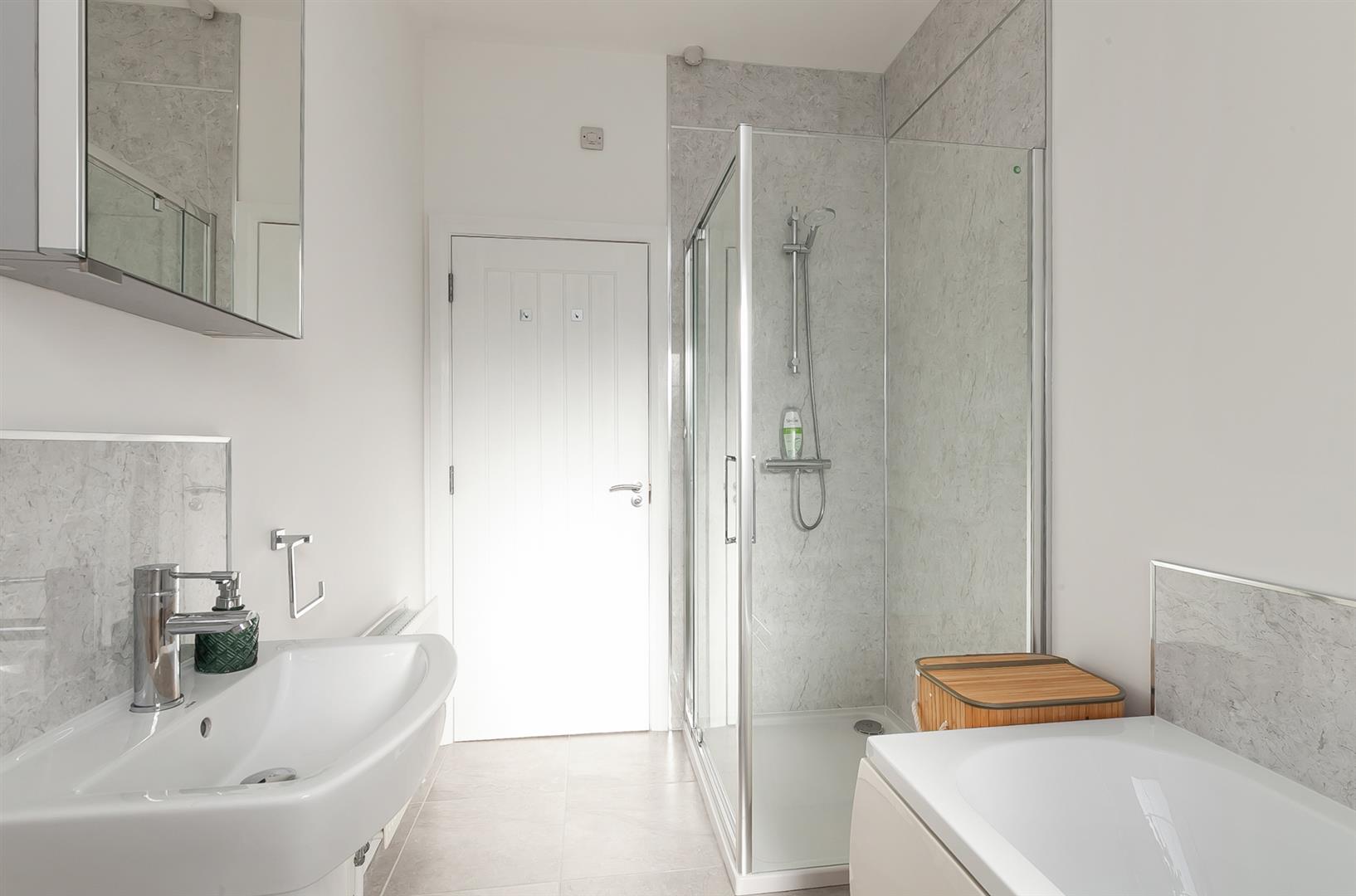 Contemporary, white, four piece suite comprising panelled bath, panelled shower enclosure , pedestal wash hand basin and WC. Thermostat controlled mains shower unit. Splashback panelling to walls. Tiled floor.