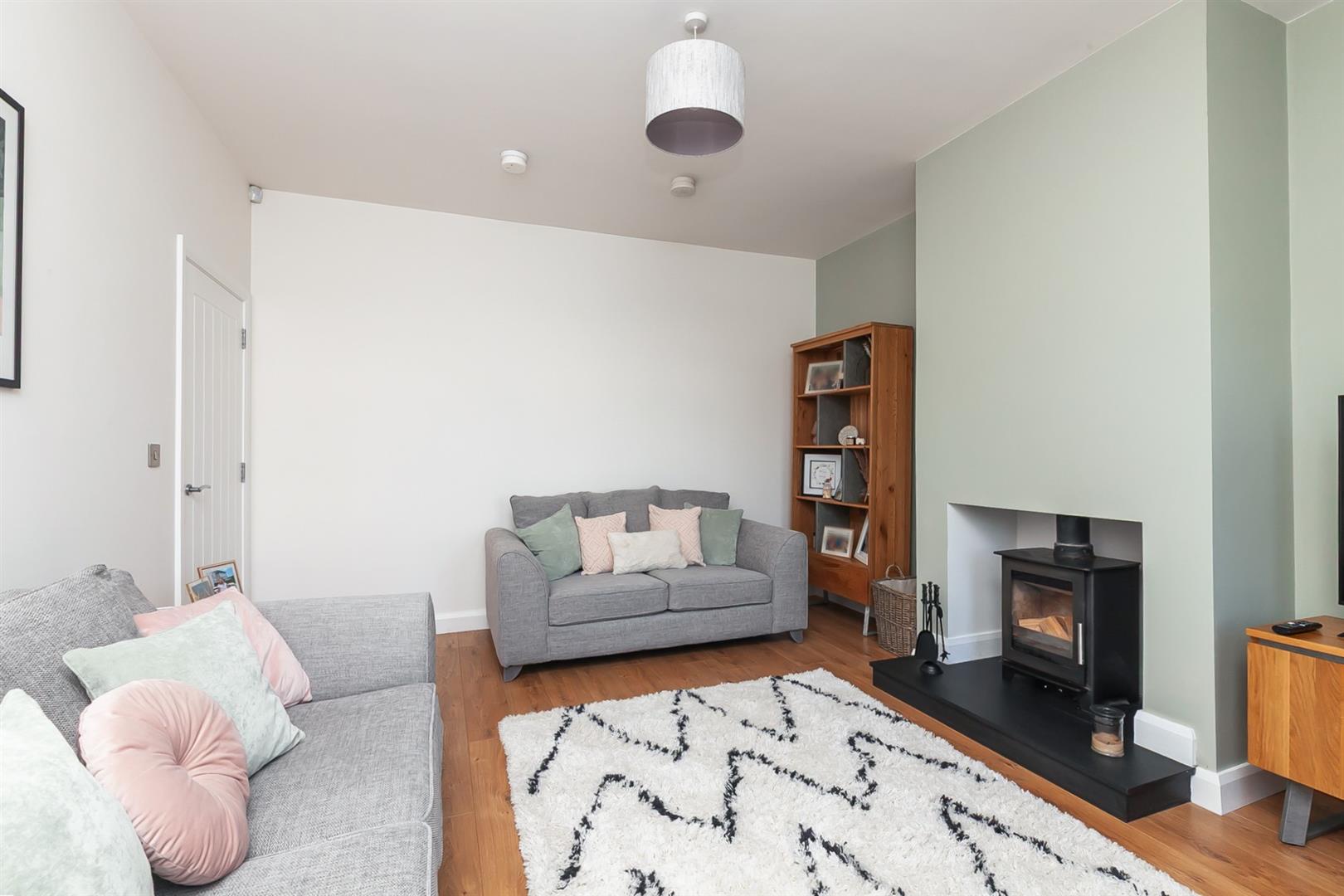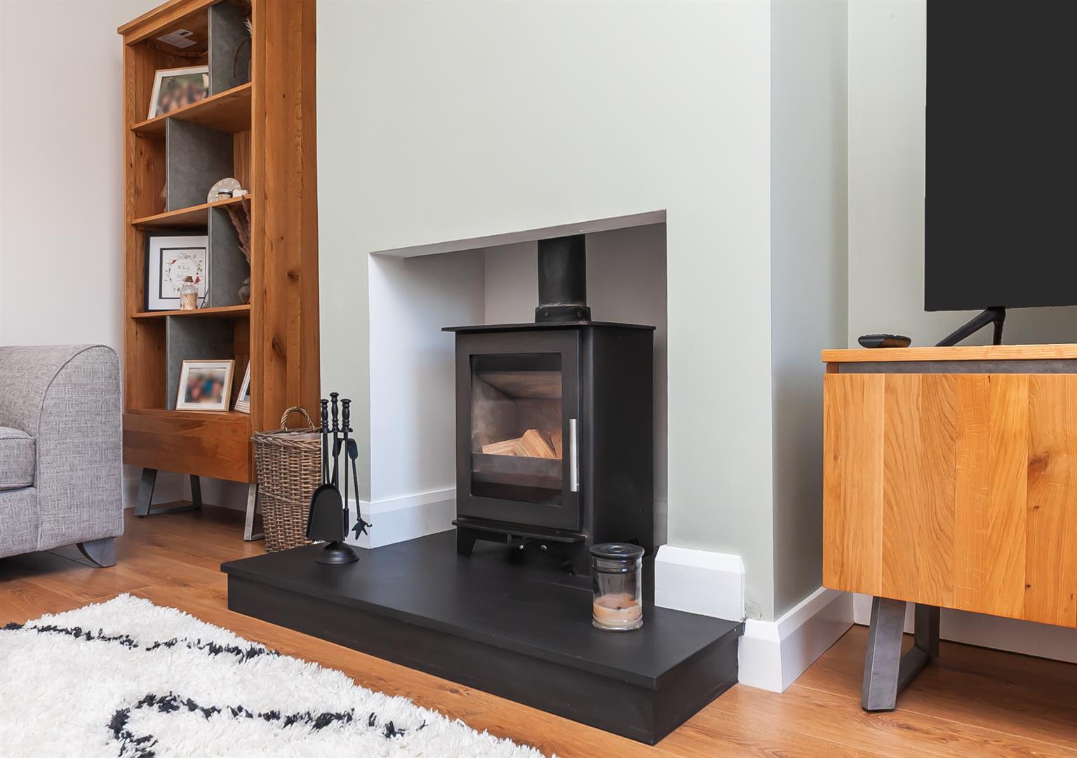 View towards landscaped green. Cast iron wood burning stove on slate hearth. Wood laminate floor covering.