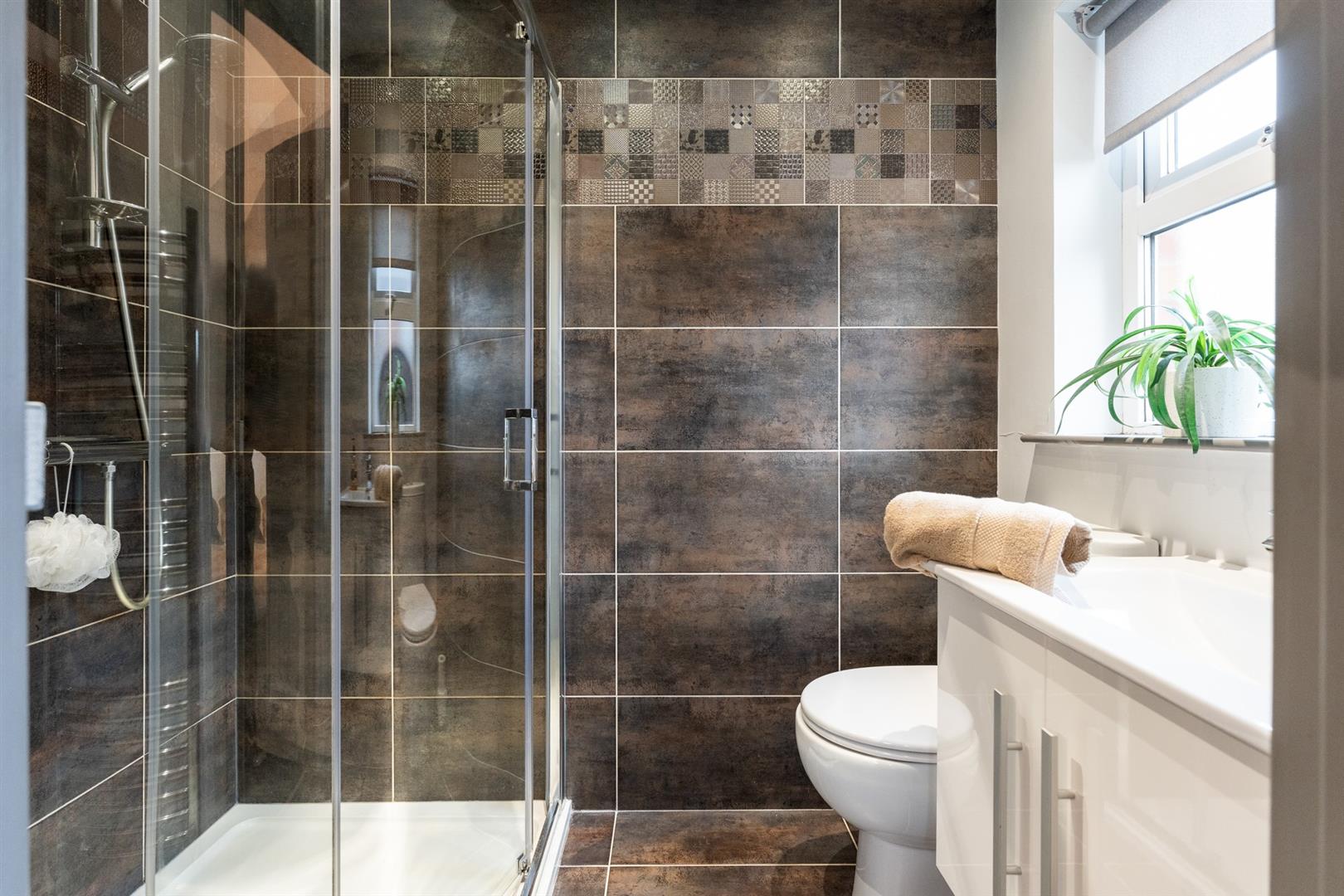 Contemporary, white, three piece suite comprising fully tiled shower enclosure, floating vanity unit and WC. Thermostat controlled mains shower unit. Part tiling to walls. Tiled floor. Chrome towel radiator.