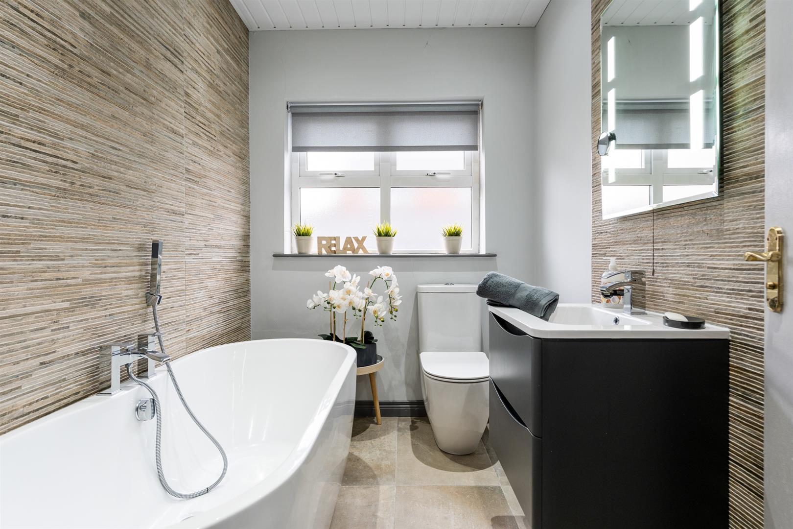 Contemporary, white, three piece suite comprising free standing bath, floating vanity unit and WC. Splashback tiling and illuminated mirror to sink area. Tiled feature wall to bath. Chrome towel radiator. Tiled floor.