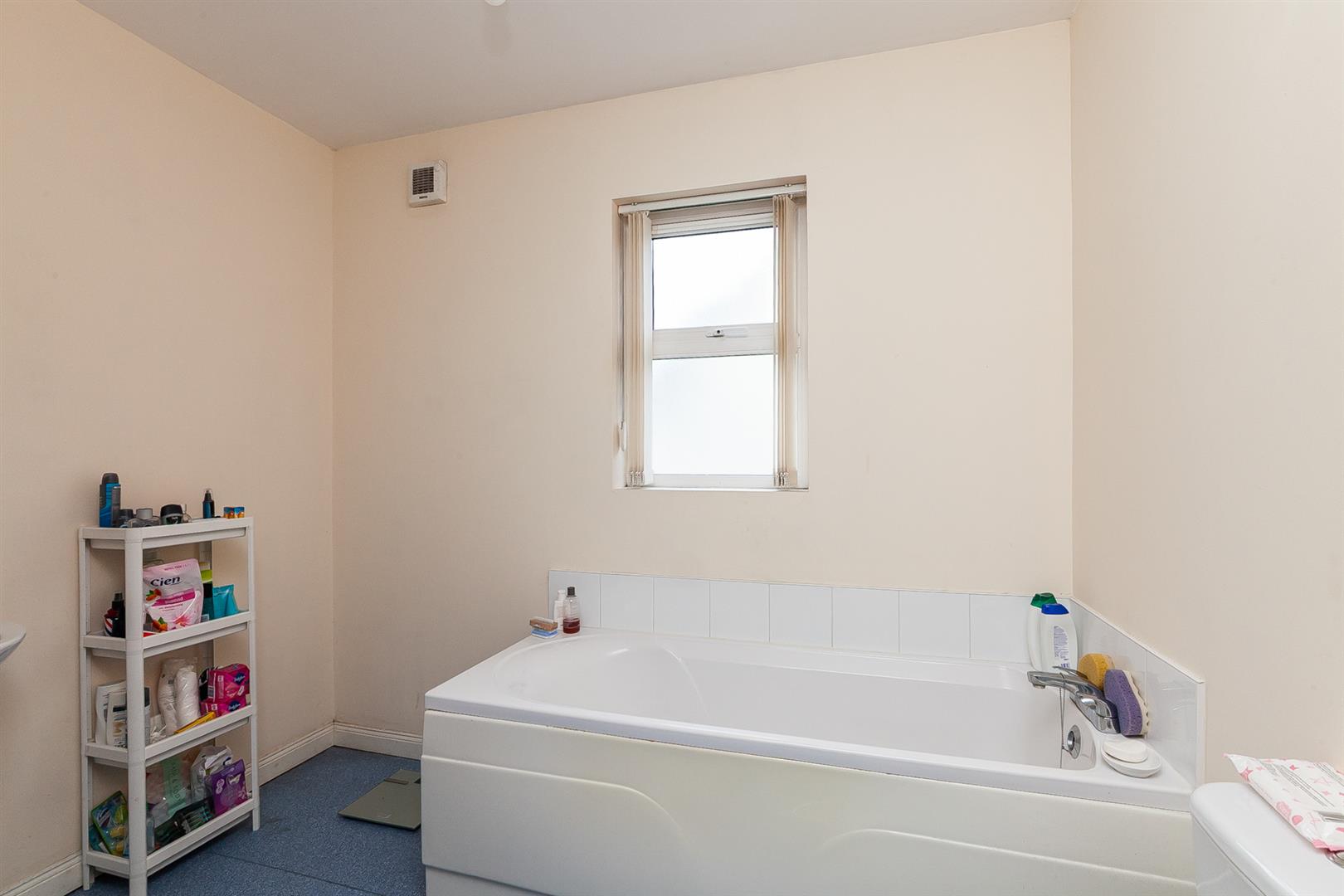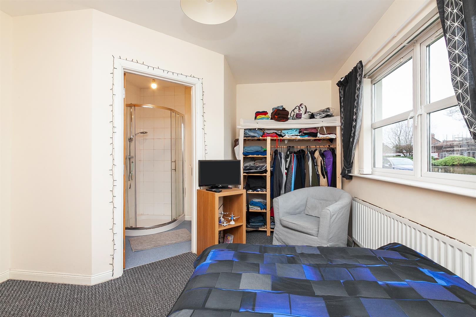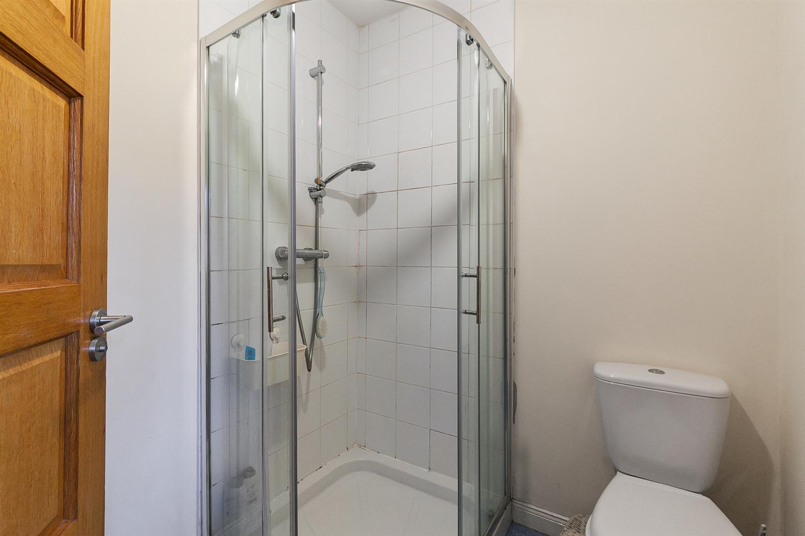 White three piece suite comprising fully tiled quadrant shower enclosure, pedestal wash hand basin and WC. Thermostat controlled shower unit. Chrome towel radiator. Tiled splash back over sink. Vinyl floor covering.