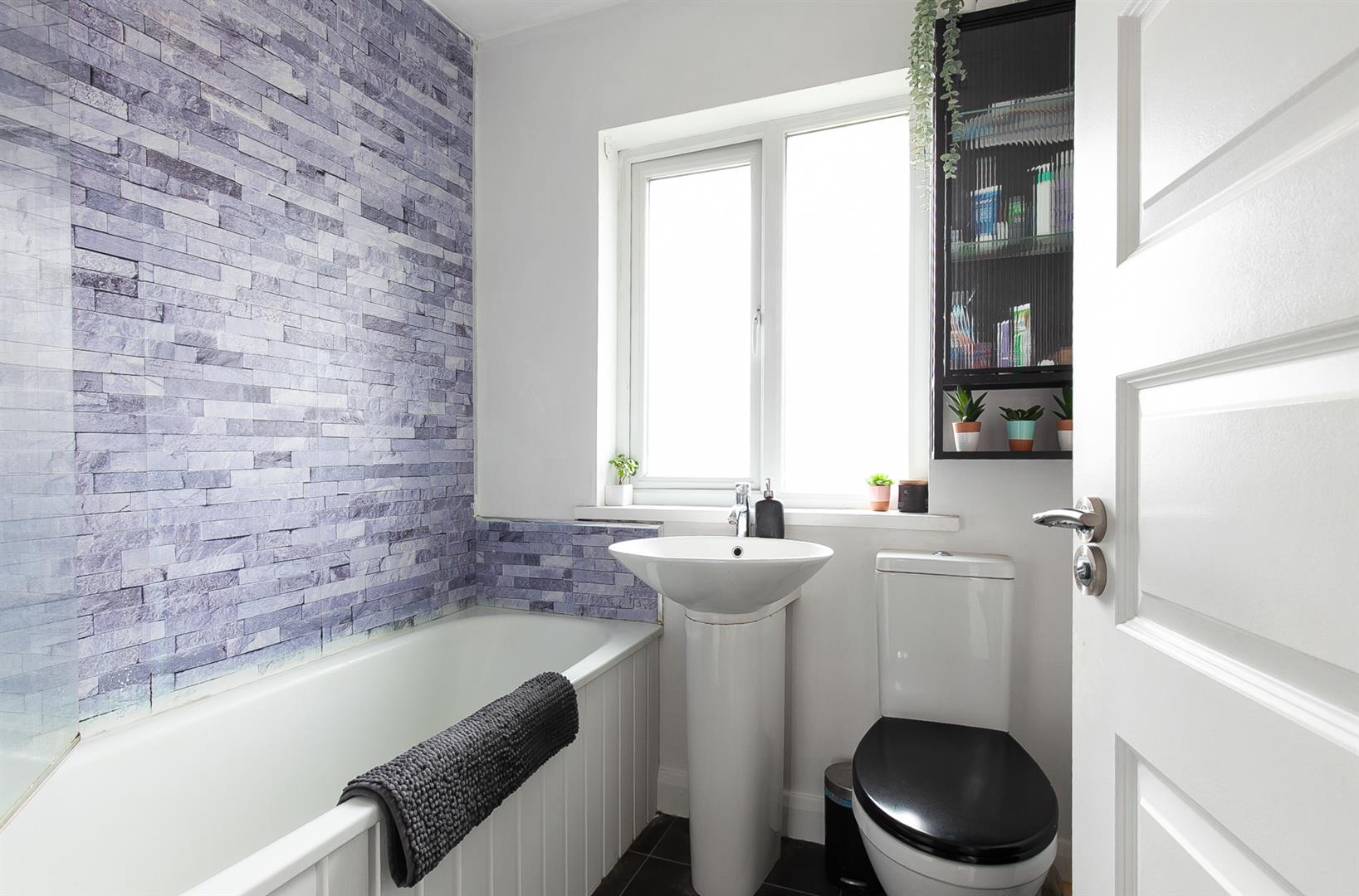 White three piece suite comprising panelled bath with shower and glass shower screen over, pedestal wash hand basin and WC. Thermostat controlled mains shower (pressurised system). Part panelling to walls.