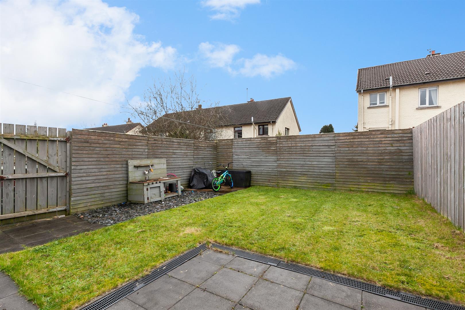 Fully enclosed rear garden finished in lawn, paved patio area and slate chippings.