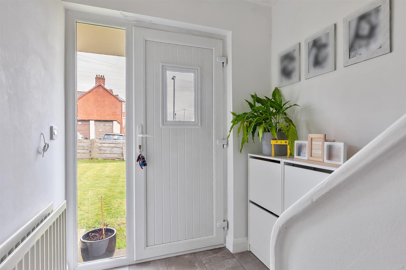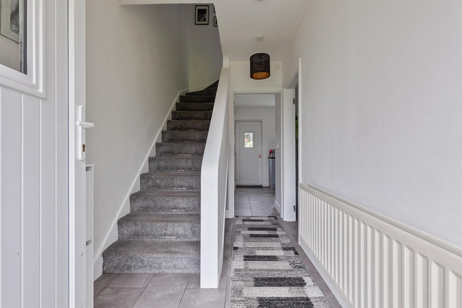 PVC double glazed front door with matching side panel. Tiled floor. Stairwell to first floor. White panelled internal doors.