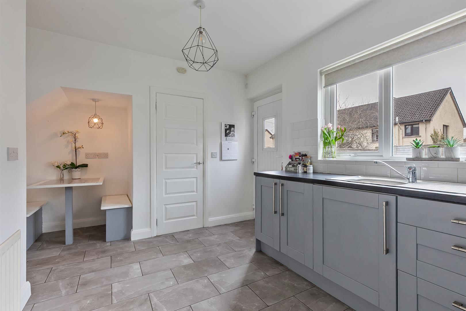 Modern fitted kitchen with range of high and low level storage units in solid oak door and contrasting granite effect melamine work surface. Stainless steel sink unit. Integrated ceramic hob with stainless steel extractor hood over. Integrated oven. Space for fridge freezer. Fitted table and seating (with storage below). Splash back tiling to walls. Tiled floor. Access to store with gas fired central heating boiler. Plumbed for automatic washing machine. PVC double glazed back door.