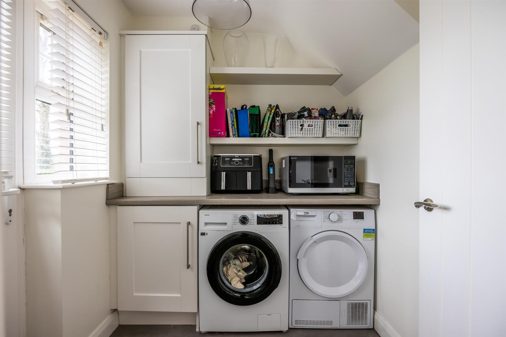 Fitted storage units with contrasting wood grain effect melamine worktop. Matching upstands to walls. Plumbed and space for washing machine. Space for tumble dryer. Gas fired central heating boiler (housed within matching unit). Tiled floor. PVC double glazed door leading to rear garden.