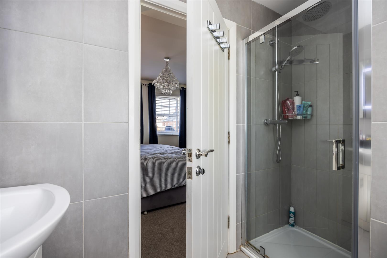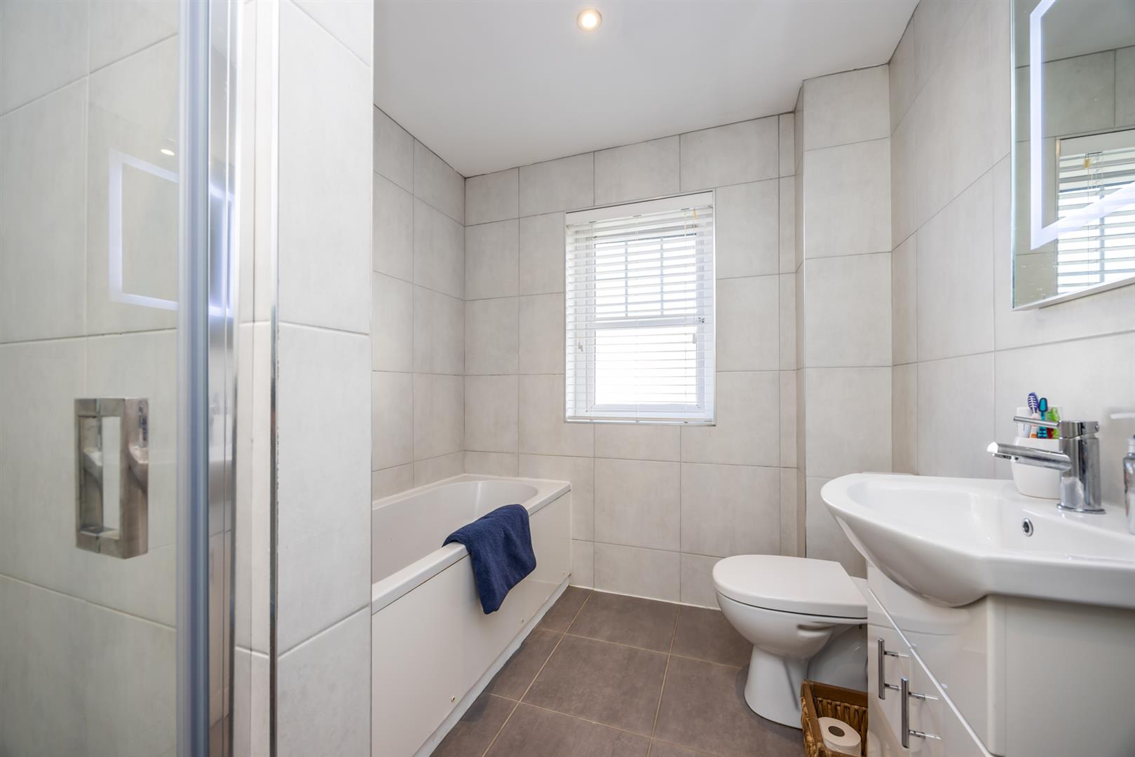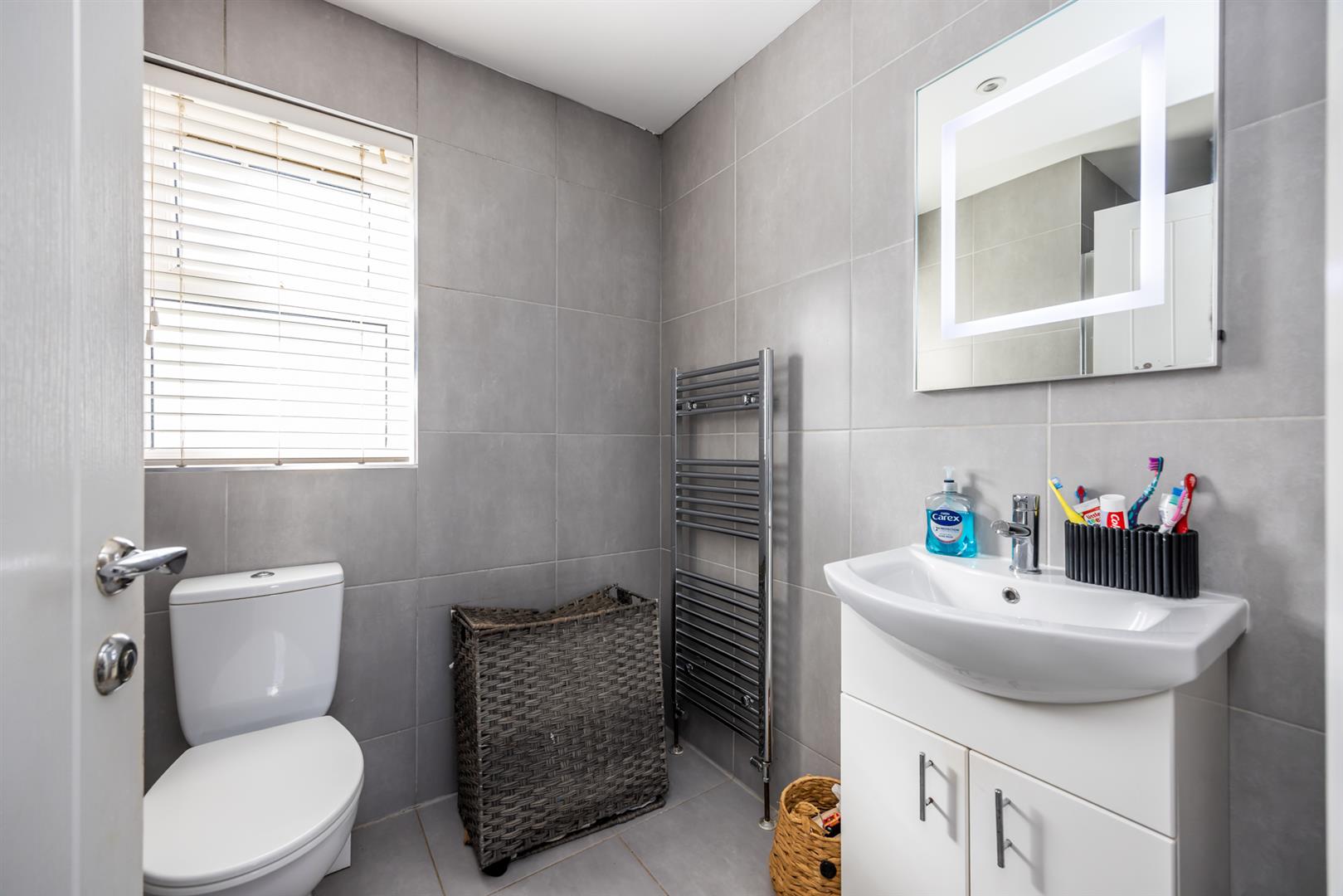 Contemporary, white, four piece suite comprising panelled bath, separate shower enclosure, vanity unit and WC. Thermostat controlled main shower unit with drench shower head. Illuminated mirror over sink. Chrome towel radiator.