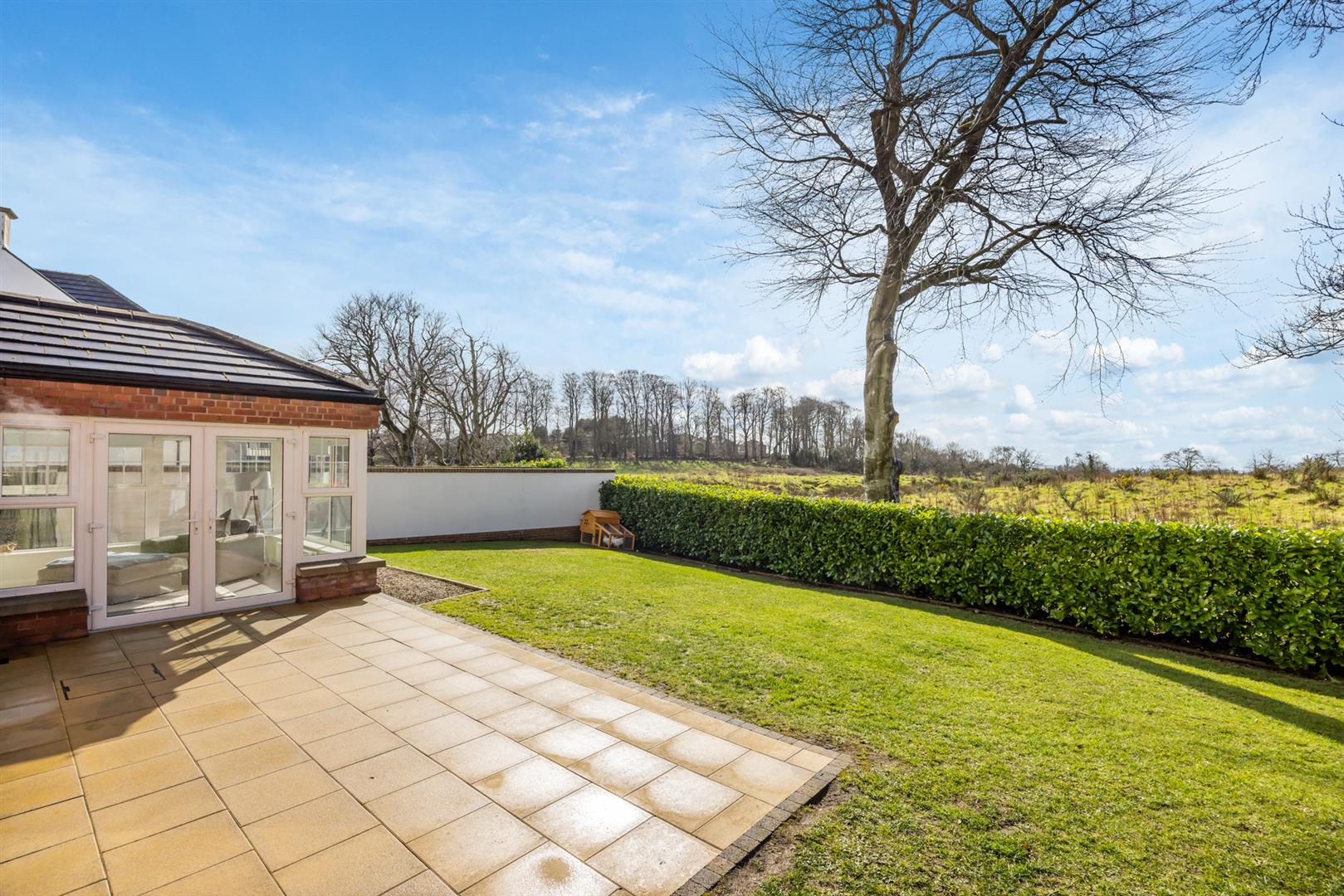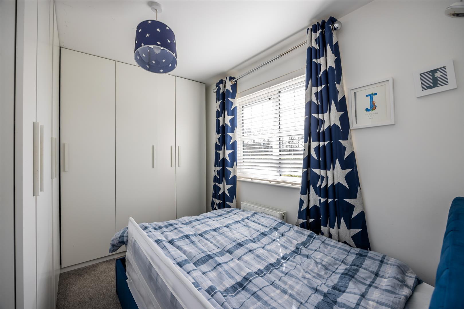 Fully enclosed rear garden finished in lawn, paved patio area, decorative stone, bin enclosure.
