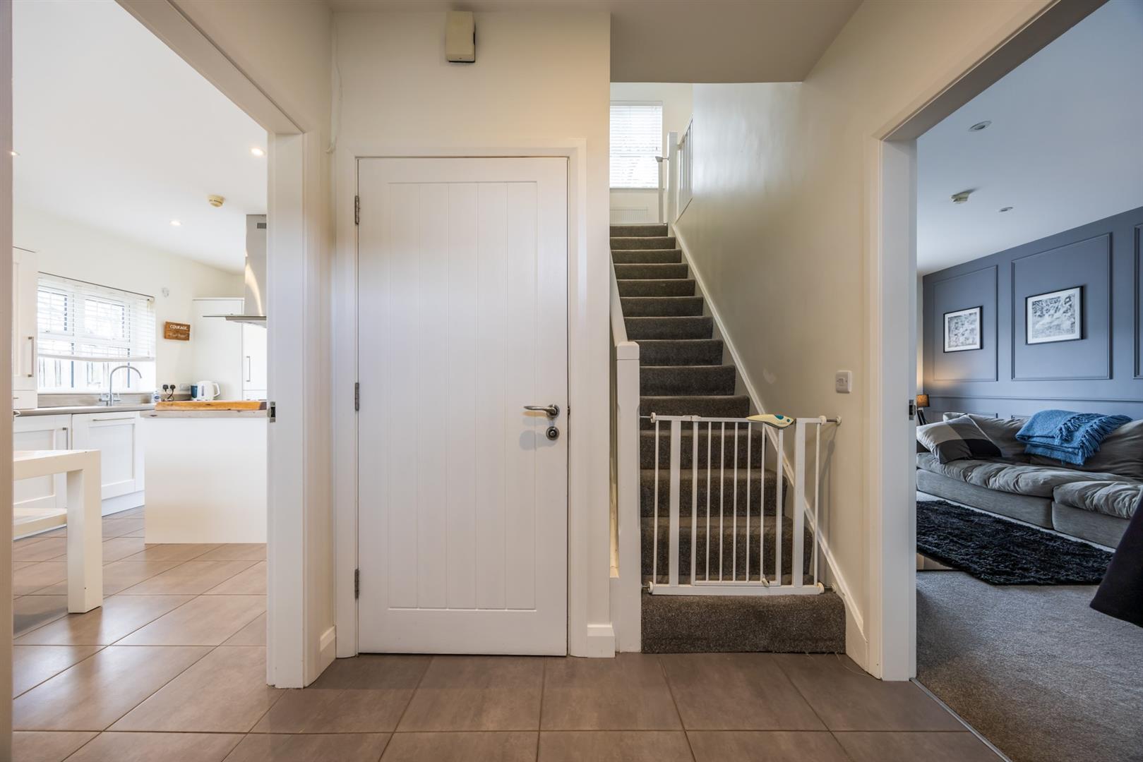 Composite, panelled front door with hardwood double glazed fanlight over. Tiled floor. Feature height ceiling continuing throughout remainder of ground floor. Stairwell to first floor.