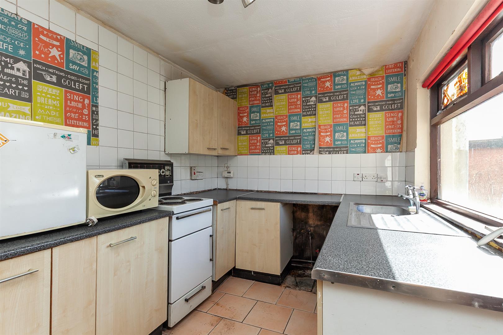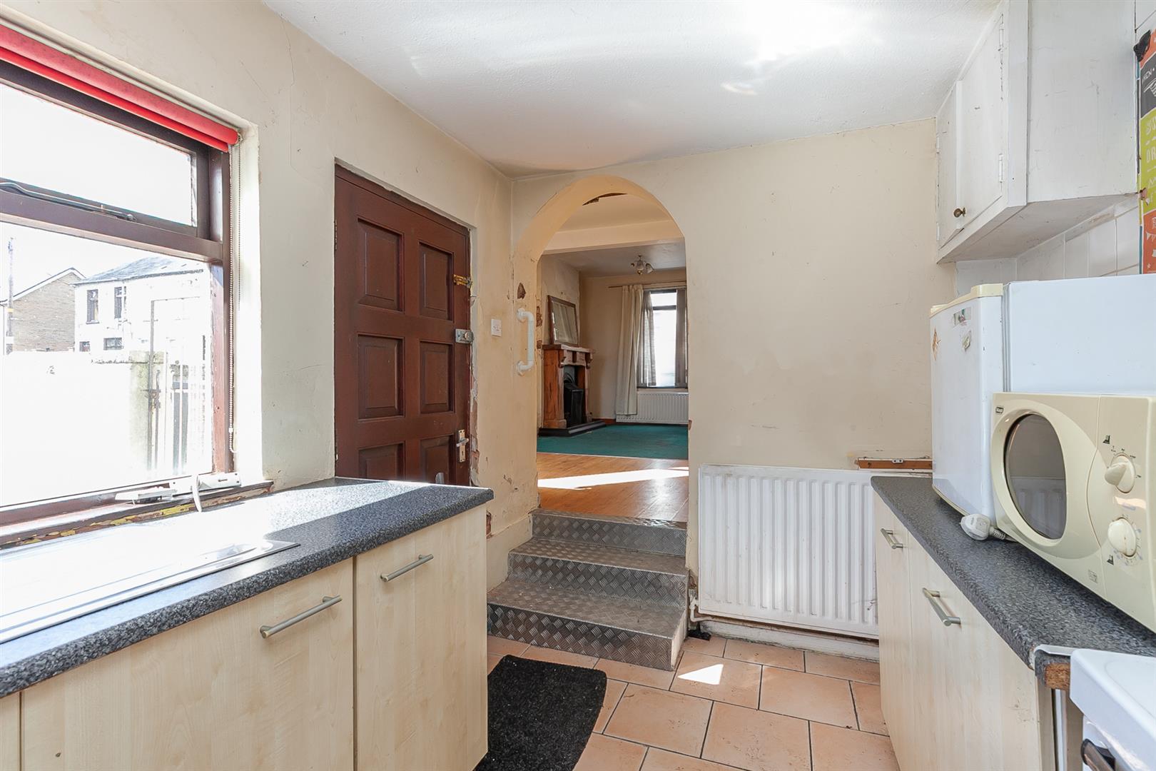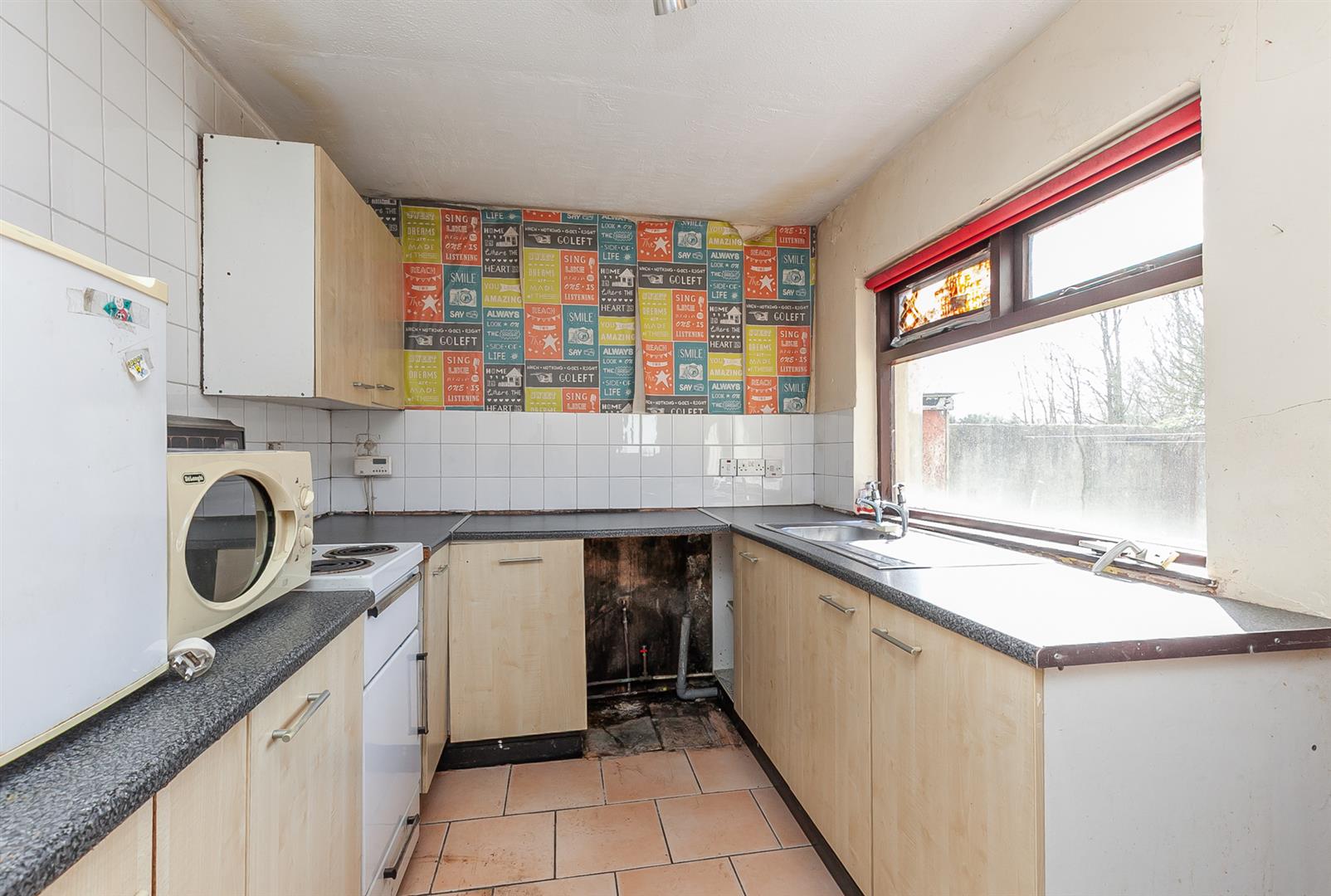 Fitted kitchen with range of high and low level storage units and contrasting melamine work surface. Space for cooker. Stainless steel sink unit with draining bay. Space for fridge freezer. Plumbed for automatic washing machine. Part tiling to walls. Hardwood rear door.