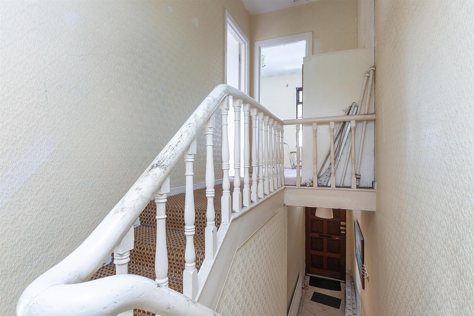 Hardwood front entrance door with glazed fanlight over. Tiled floor. Stairwell leading to first floor.