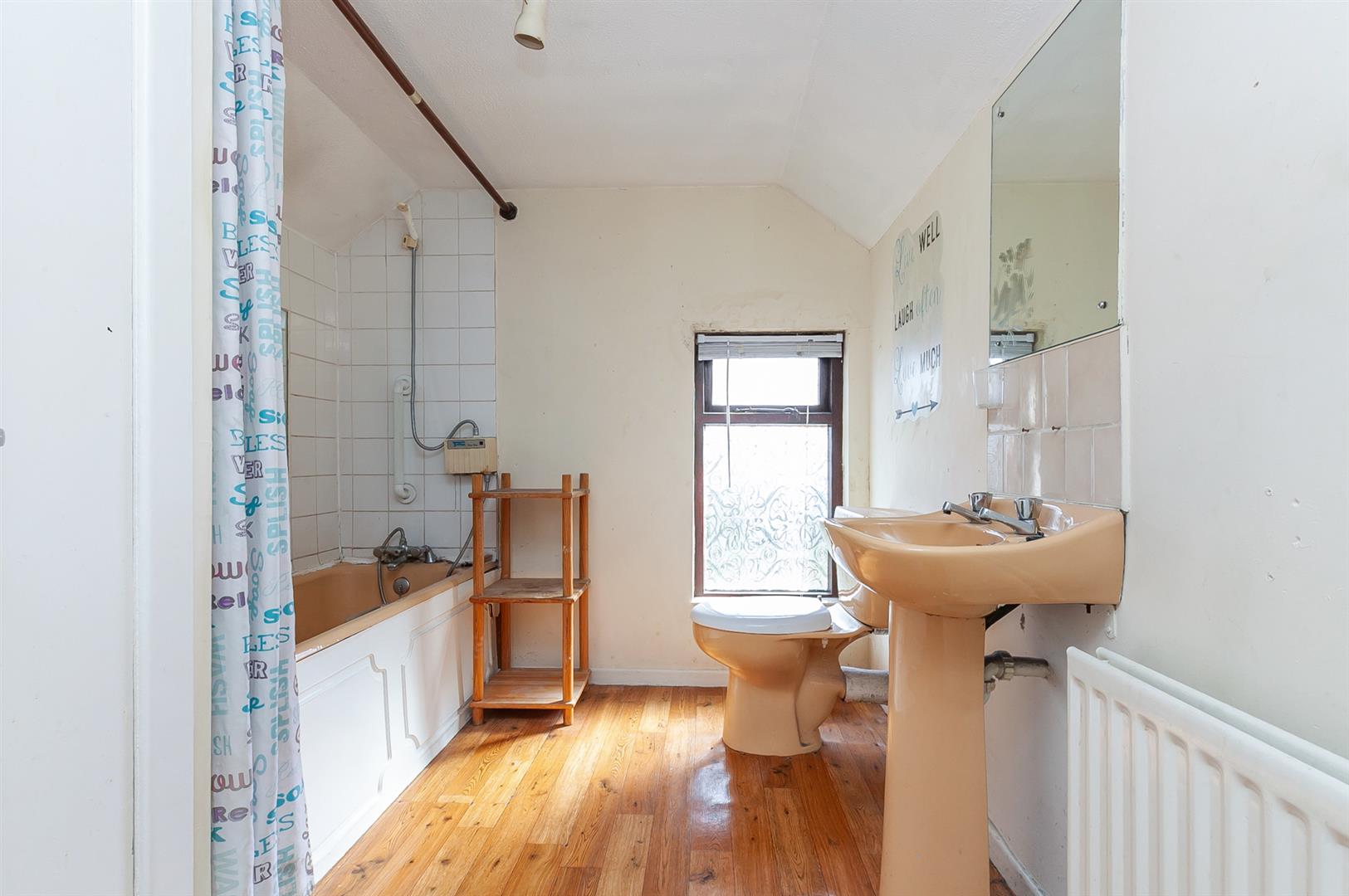 Three piece coloured suite comprising panelled bath with mixer tap over, pedestal wash hand basin and WC. Splashback tiling to bath and sink. Built in shelved store.